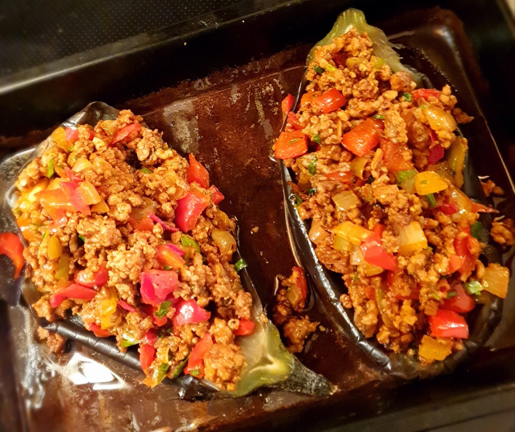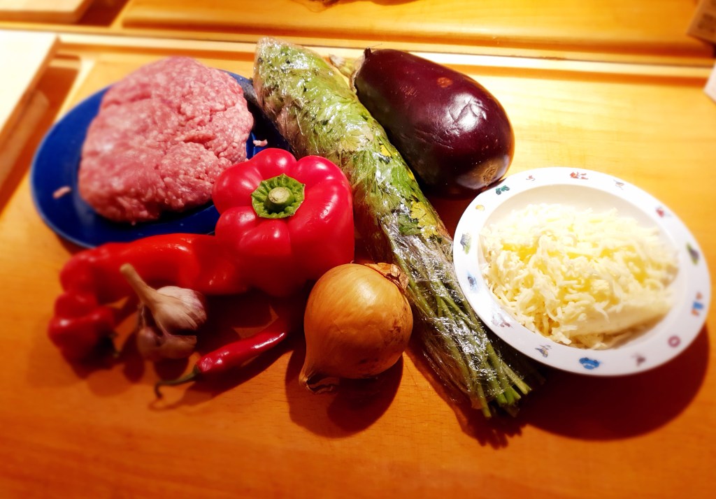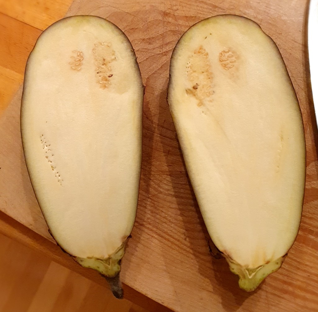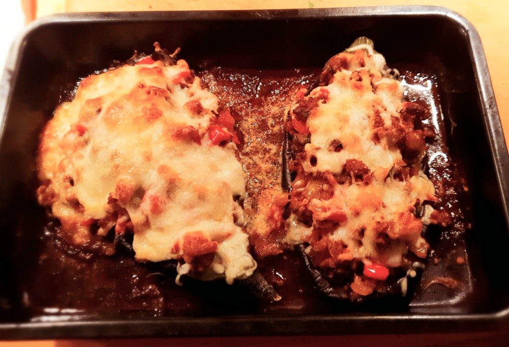 Det er utrolig godt å grille skiver av aubergine, bare pensle dem med olje og ha på salt og pepper. Moussaka er en kjent rett, spesielt for de som reiser til Hellas. Det er nesten som en lasagne med lammekjøttdeig og aubergine istedenfor pasta og det er litt arbeid å lage den. Her har jeg skrapt ut kjøttet fra aubeginen og fylt dem med en stekt blanding av auberginekjøtt og lammekjøttdeig og gratinert dem i ovnen.