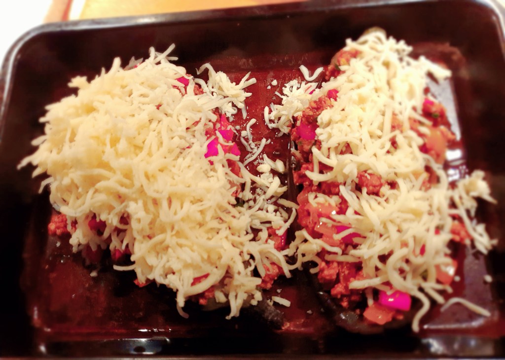 Legg de avrente aubergineskallene i et ovnsfast fat med litt olje i bunnen. Skallene er nå myke og blir flate. Fyll rikelig med kjøttdeigblanding og strø over ost etter hvor mye du liker. Gratiner ved 200 grader C i ca 13 minutter.