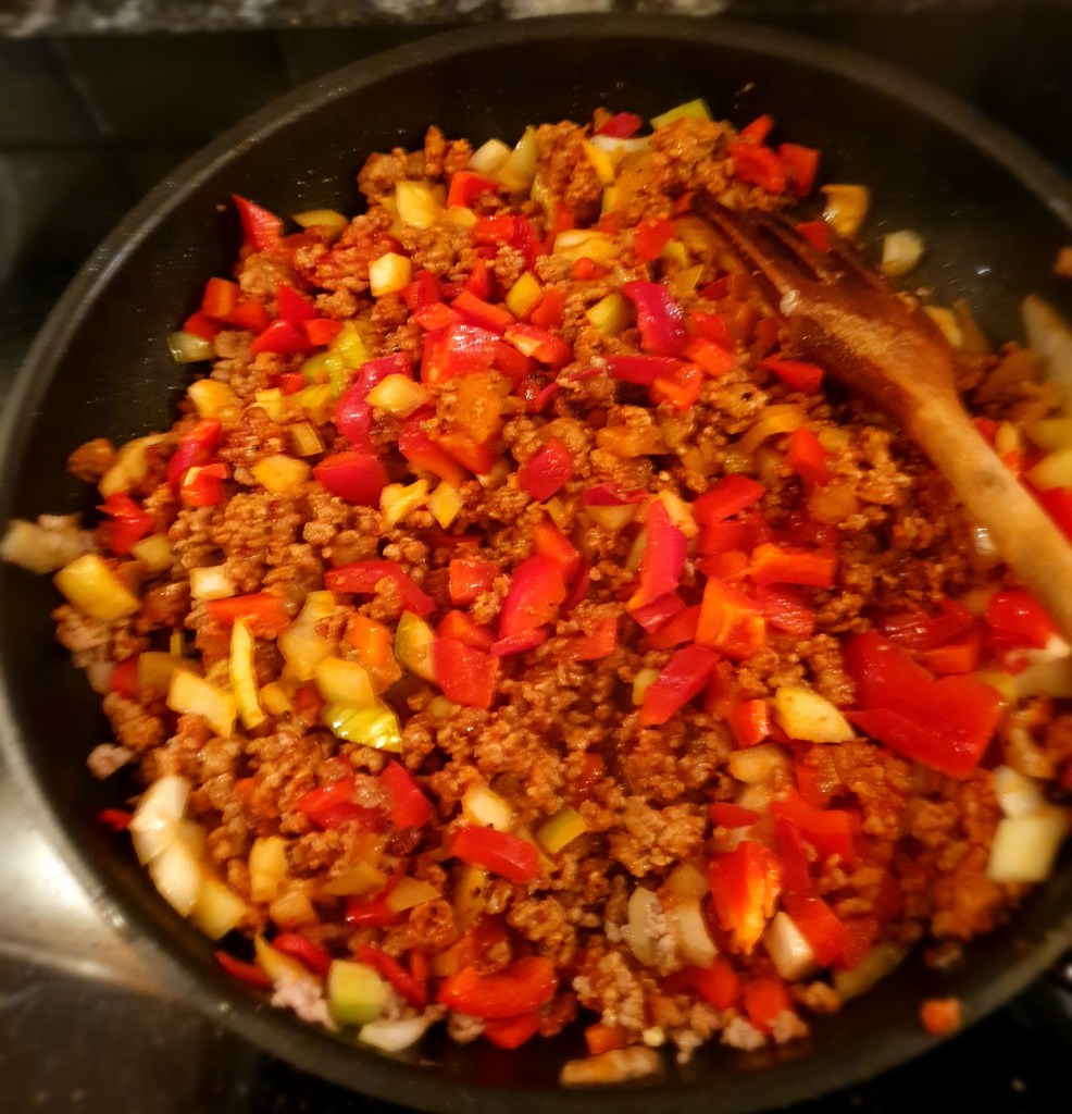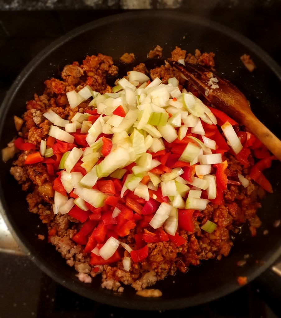 Tilsette paprikabitene, løken og chilien og bland godt. Stek 10 minutter til paprikaen er blitt litt mykere. Bland inn hakket persille.