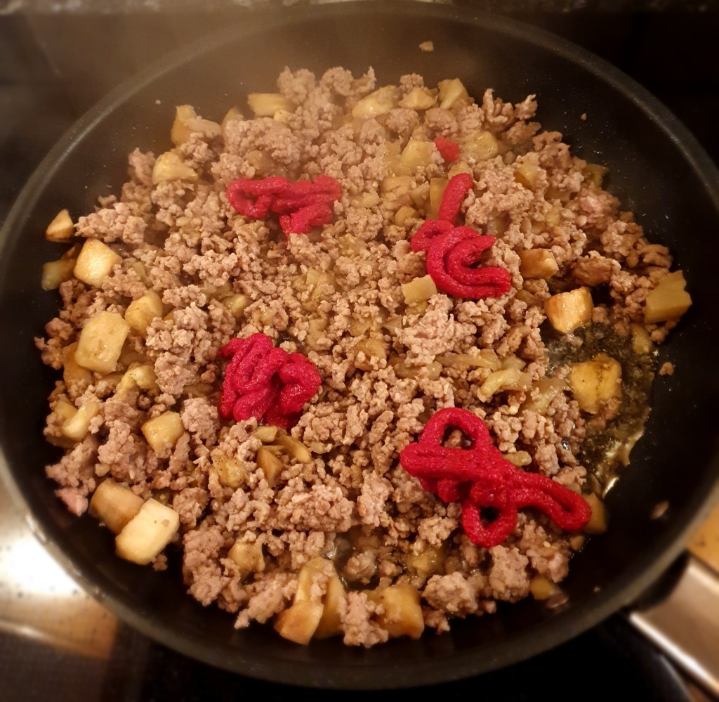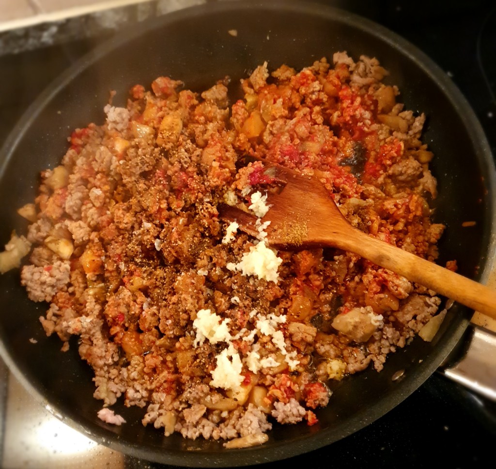Til fyllet stekes kjøttdeigen sammen med auberginekjøttet til lammekjøttet har fått god farge. Tilsett tomatpuréen, rør rundt slik at puréen blandes med det andre og stek et par minutter. Press hvitløksfeddene direkte over kjøttblandingen.