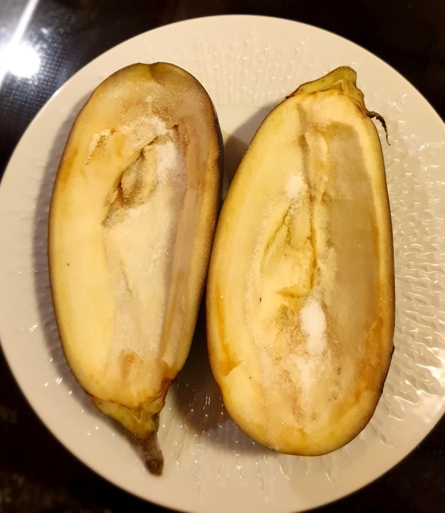 Lam igjen, denne gangen i form av kjøttdeig kombinert med aubergine. De burgunderrøde auberginene ser så flotte og svulmende ut der de ligger i grønnsakdisken- likevel tror jeg mange har en liten bøyg for å putte dem i handlekurven for hva skal du bruke dem til? Aubergine inneholder noen bitre stoffer som fjernes ved å behandle dem med salt som trekker ut disse stoffene.