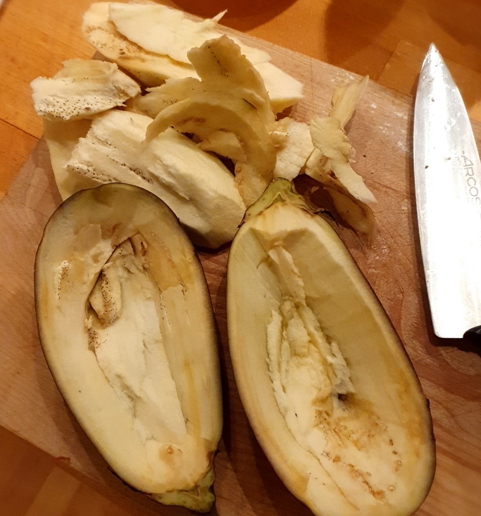 Start med å tilberede auberginen(e). Del dem i to og skrap/skjær ut det meste av kjøttet. Pass så du ikke skjærer hull i skallet.