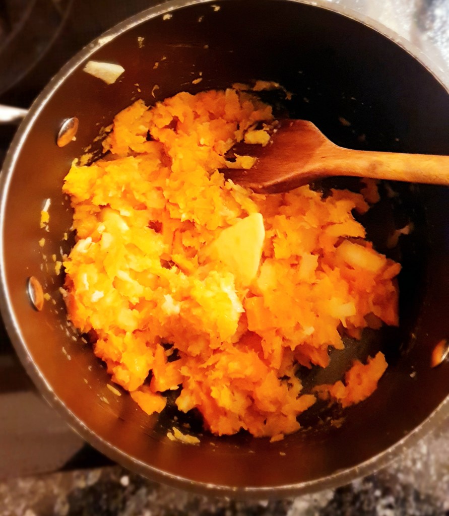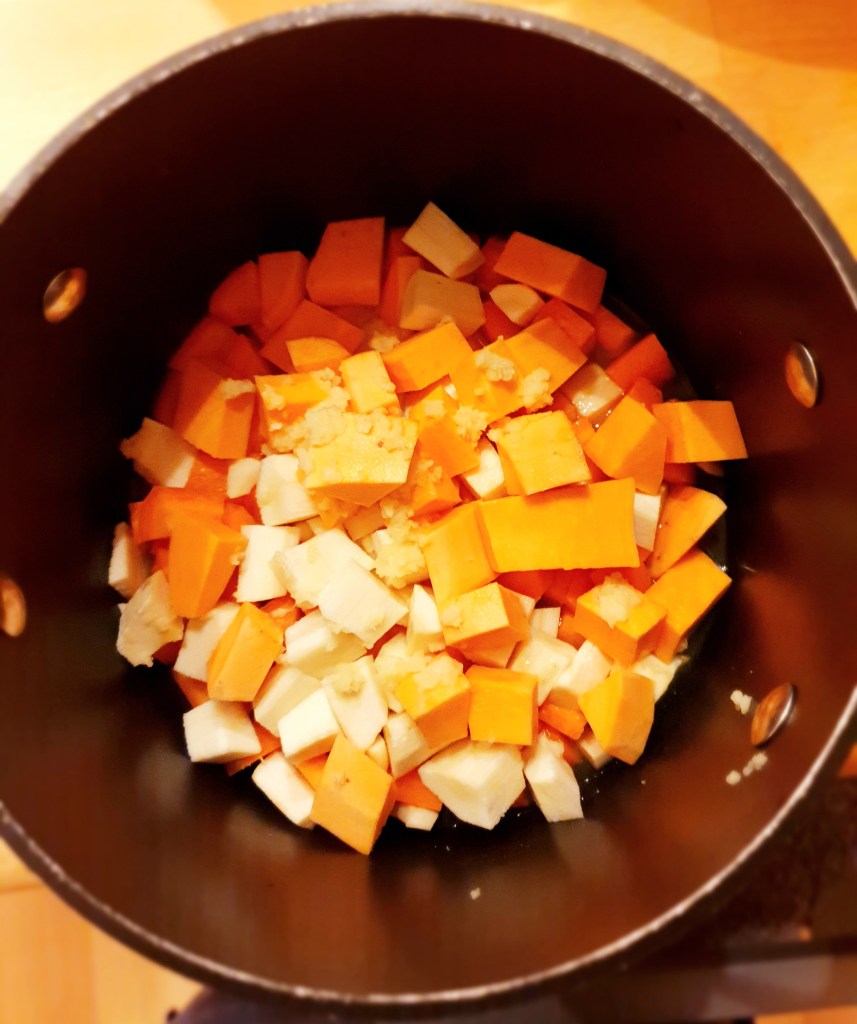 Grønnsakene ble delt i grove biter og kokt sammen med appelsinsaft og vann til alt var mørt. Væsken ble helt av og grønnsakene ble most med en potetmoser. Noen klatter smør ble rørt inn og mosen ble smakt til med salt og grov pepper.