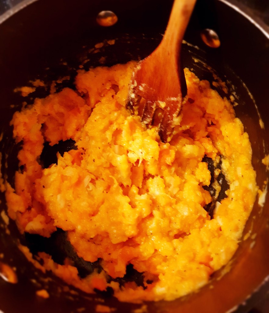 Et godt alternativ til kokte gulrøtter er å lage mos av dem. Ekstra smaksrikt blir det om du blander inn andre rotfrukter også, slik som her hvor jeg har brukt pastinakk og søtpotet. Grønnsakene er kokt sammen med appelsinjuice, hvitløk og fersk revet ingefær. Til hverdags liker jeg best en litt grov mos mens jeg til andre anledninger lager den finere, nærmest som en pure.