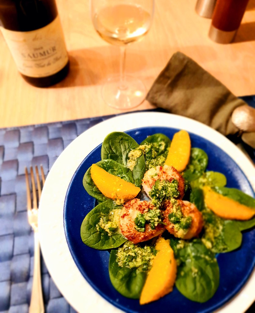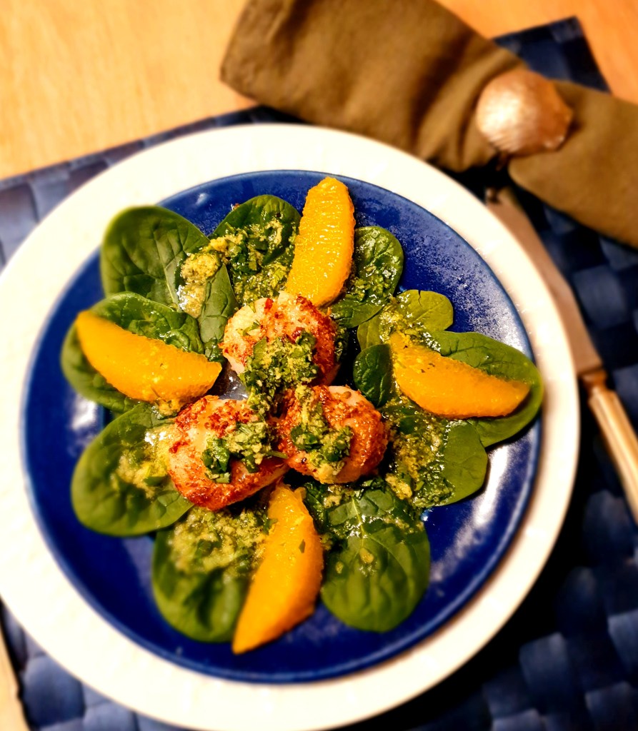 Spre litt grønt utover 2 tallerkener. Her er brukt babyspinat. Plasser kamskjellene i midten og legg appelsinfiléter rundt. Spre dressingen over skjellene og litt ellers også. Vær raus- du skal bruke opp hele dressingen.