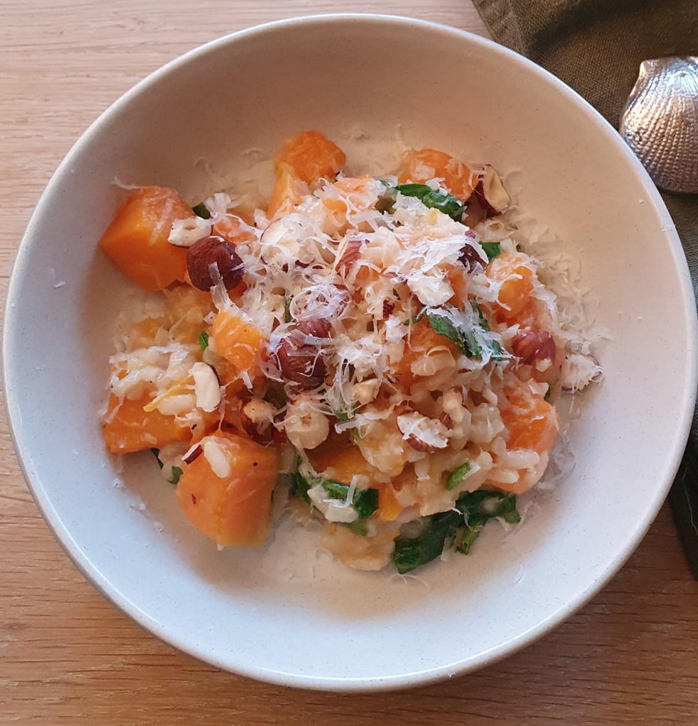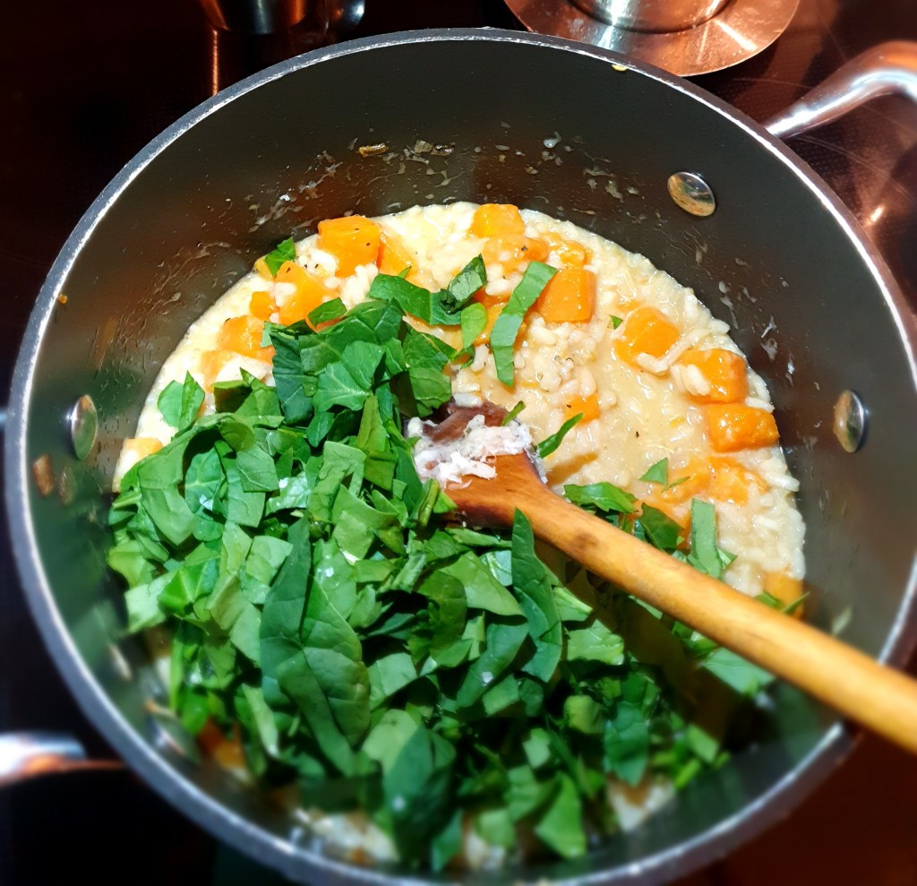 Risotto er en rask rett å lage og passer både til lunsj og til middag. Den kan smaksettes med det meste. Her er en utgave med gresskar og spinat. Får du resten kan risottoen lett varmes på ny, husk bare å tilsett litt væske.