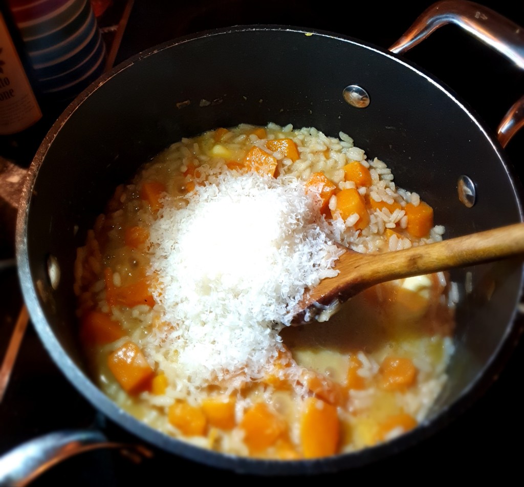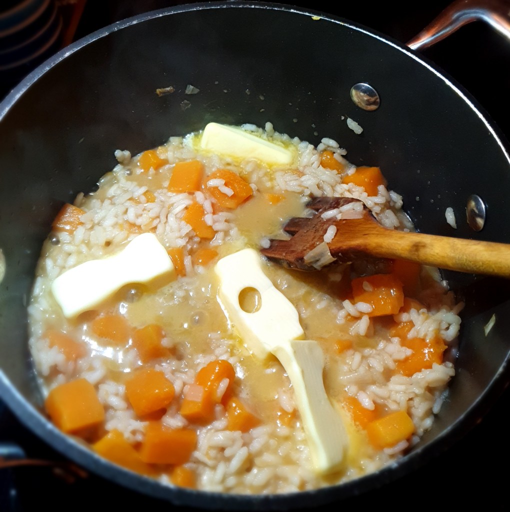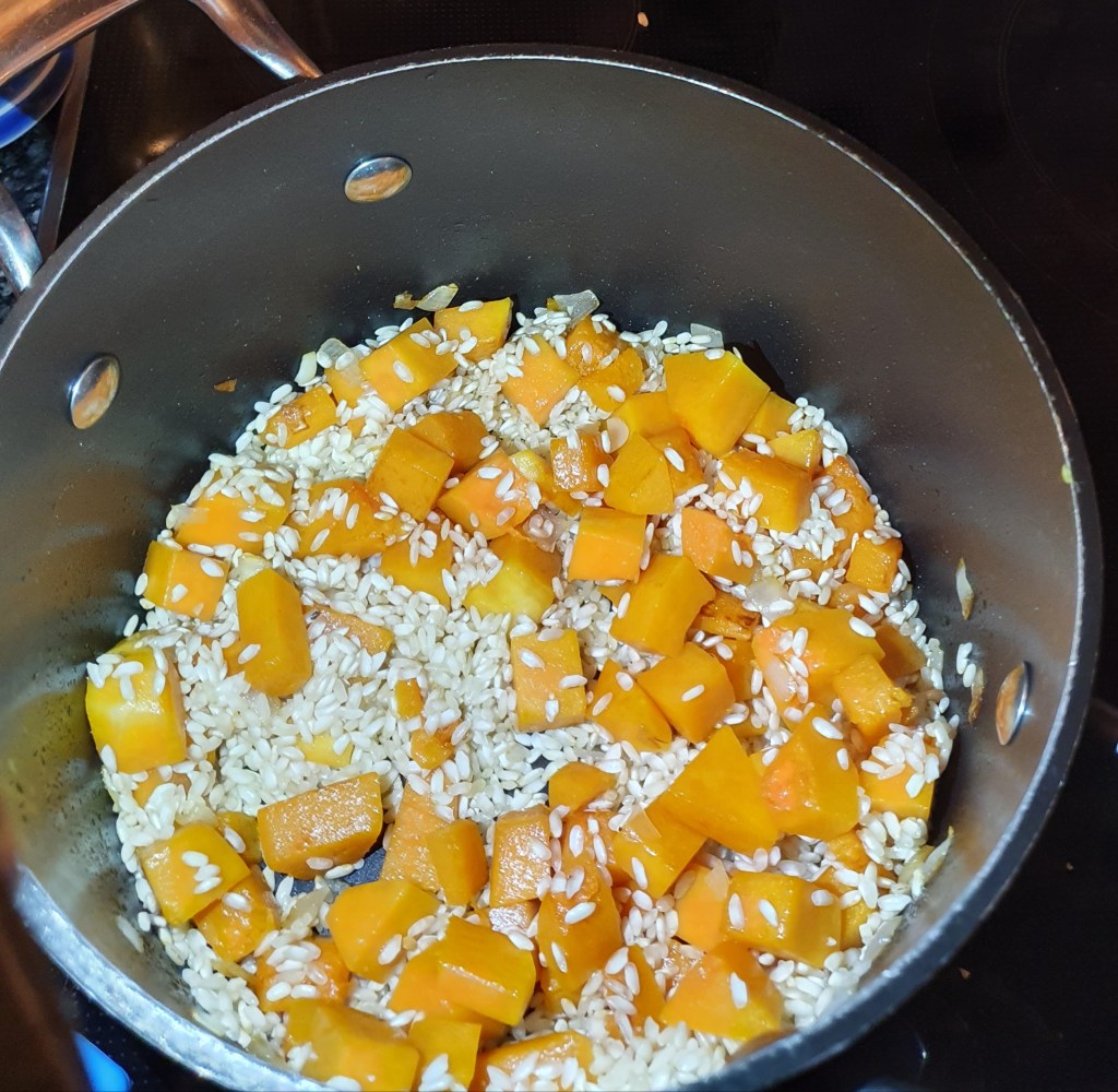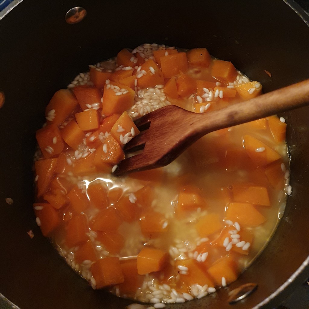 Kjernene og skallet fra gresskaret ble fjernet (jeg syntes det er best å skjære gresskaret i skiver og skrelle skivene, skallet er ganske hardt). Kjøttet ble skåret i terninger og sjalottløken ble skrelt og hakket. Begge ble stekt i en gryte med olje i ca 5 minutter. Deretter ble risen tilsatt og blandet godt med oljen slik at alle kornene var dekket. Stekte i et par minutter før vinen ble tilsatt. Denne ble kokt inn til ca halvparten av volumet før selve kokingen av risen startet. Kyllingkraften ble tilsatt litt etter litt og fikk koke inn mellom hver tilsetning. Jeg brukte ca 25 minutter på dette. Risen skal være al dente. Koker du den utover det stadiet blir den bløt og risottoen blir mer kremet. Hvis væsken koker inn før risen er ferdig tilsett litt vann og kok videre.
