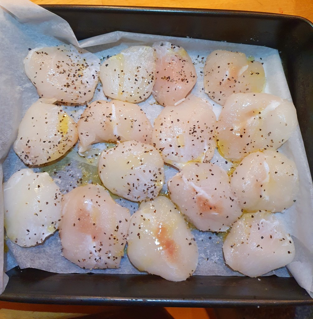 Kjakene (500-600 gram) ble lagt på bakepapir i en ildfast form. Flaksalt og grov pepper ble drysset over og olivenolje ble ringlet over. Snudde så alle kjakene og gjentok på den andre siden. Presset over saften fra 1/2 sitron. Kjakene ble bakt i ovnen ved 200 grader C i 8-10 minutter.