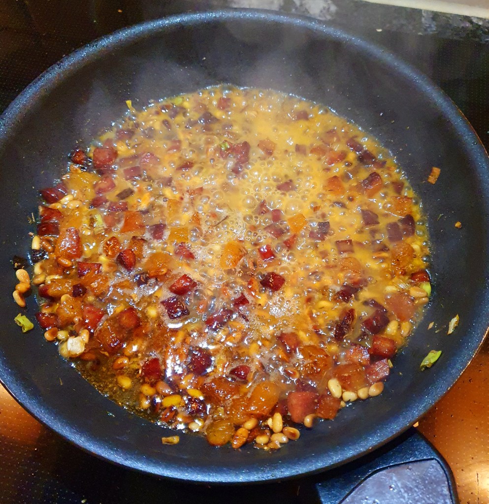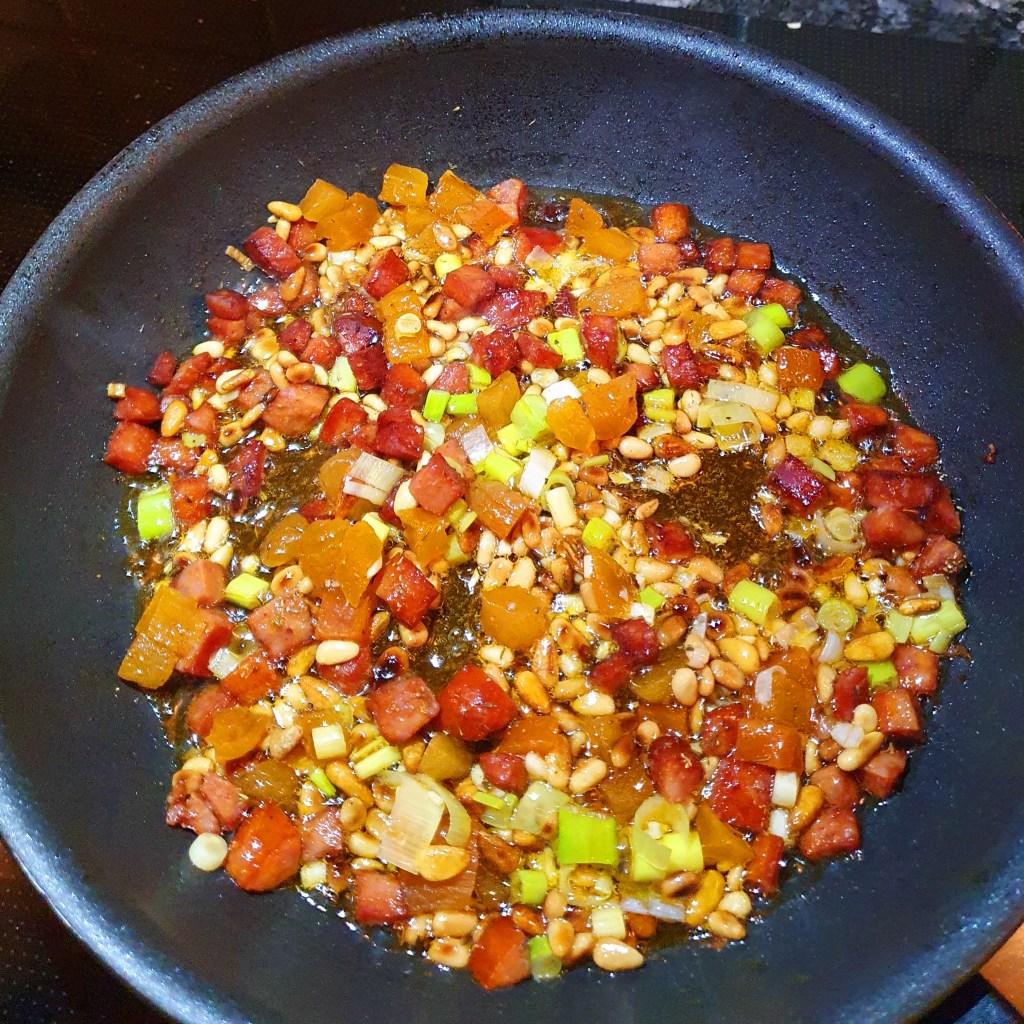 2-3 spiseskjeer pinjekjerner ble ristet på tørr panne til de fikk litt farge. Satte dem tilside. Skinnet på to chorizopølser (ca 100 gram) ble fjernet og pølsene ble skåret i små terninger. 2 vårløk ble renset og delt opp i mindre biter, 8 tørkede aprikoser ble også skåret i små biter og 2 hvitløksbåter ble renset og finhakket. En liten stekepanne ble fylt med rapsolje så bunnen var helt dekket. Chorizobitene ble stekt et par minutter på nokså høy varme før 1 god teskje malt koriander og 1 god teskje tørket timian ble tilsatt og rørt inn i fettet. Deretter ble vårløken, aprikosene, hvitløken og pinjekjernene tilsatt. Rørte alt sammen og stekte ved høy varme et par minutter før varmen ble skrudd ned og alt fikk surre i ca 10 minutter. Rett før servering ble saften fra en sitron tilsatt.
