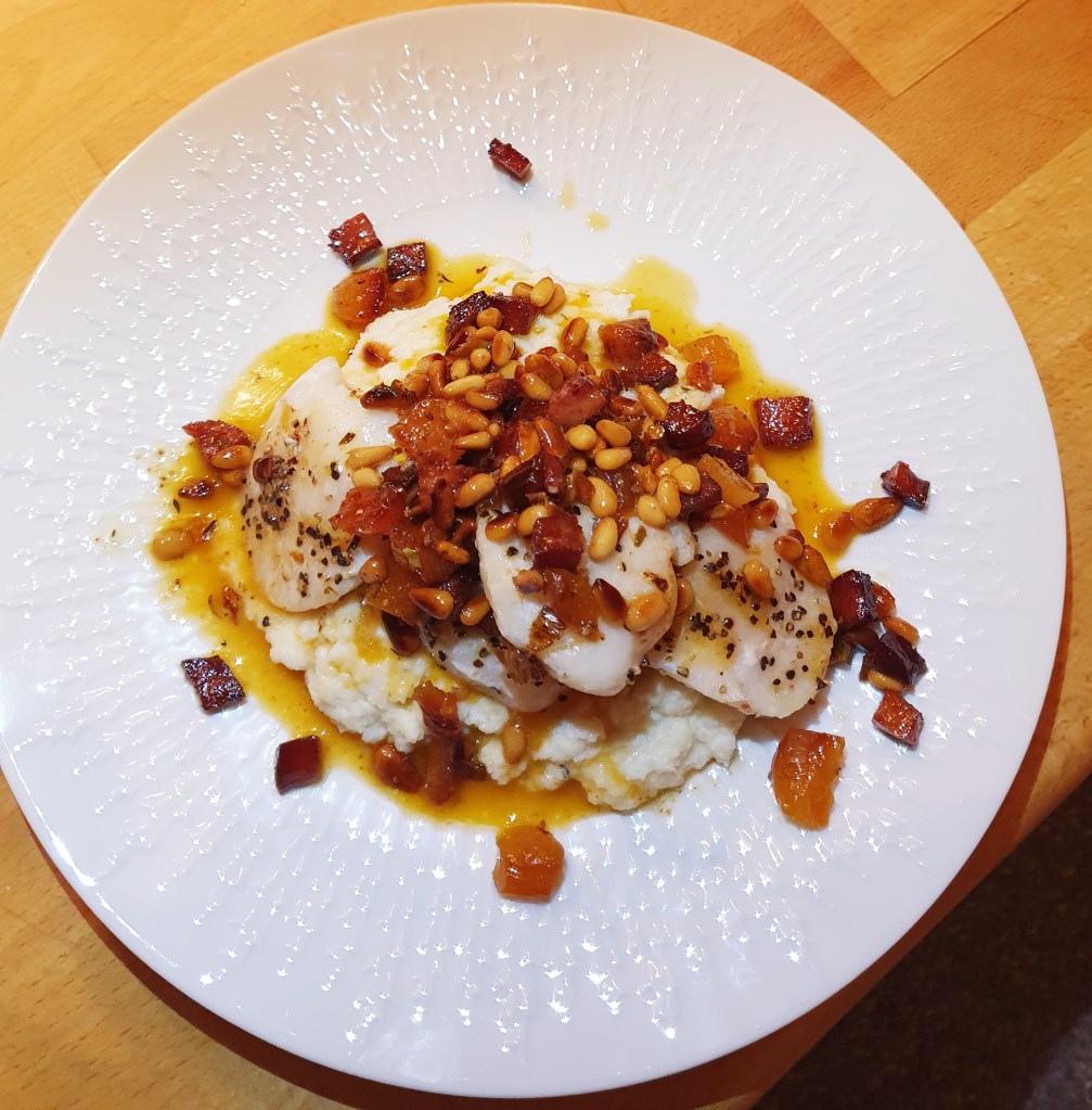 Ved servering ble skreikjakene lagt oppå blomkålpuréen og sausen helt over kjakene. Jeg lover en frisk og syrlig smaksopplevelse med litt sting fra chorizopølsene.