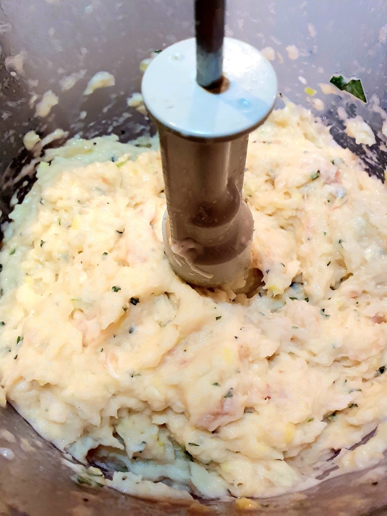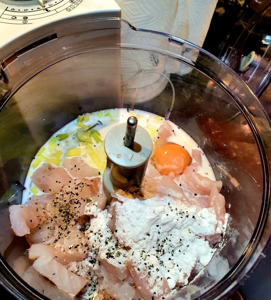 Fisken ble skåret i grove biter. Det er viktig at alle beina fjernes. Vårløken ble renset og den lyse delen ble skåret i mindre biter. Alt ble kjørt sammen til en farse i foodprosessoren. Det er viktig at du bruker puls når du gjør dette slik at du ikke ender opp med en seig masse. Farsen ble satt kaldt i 30 minutter.