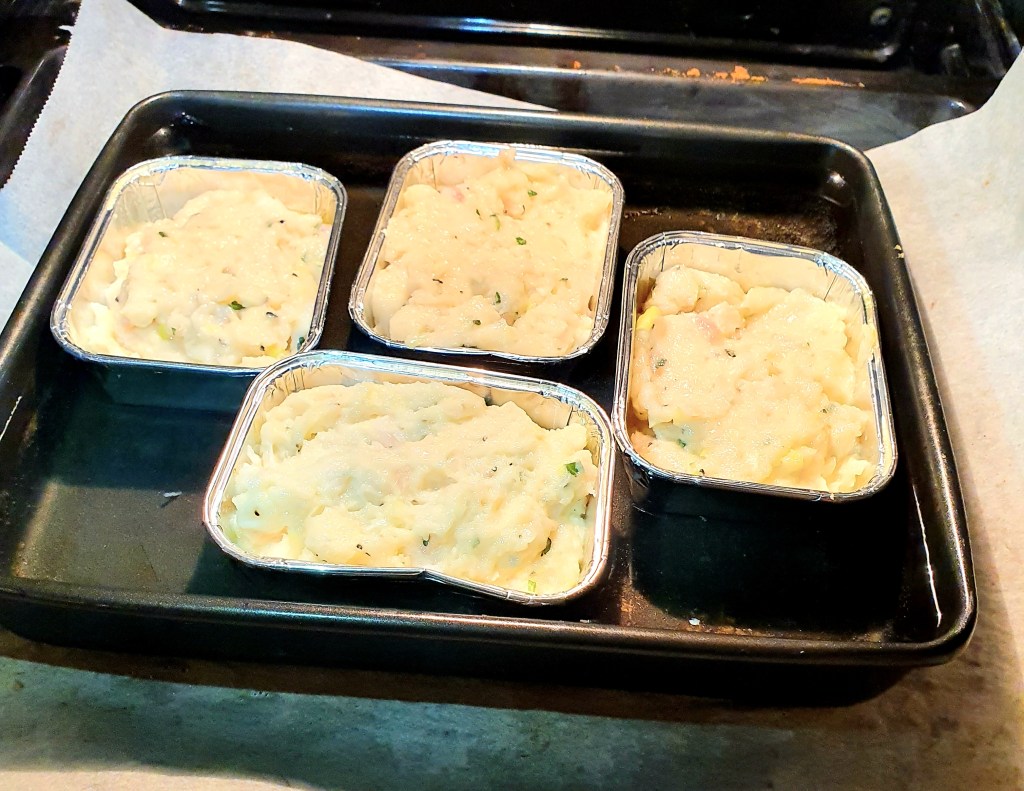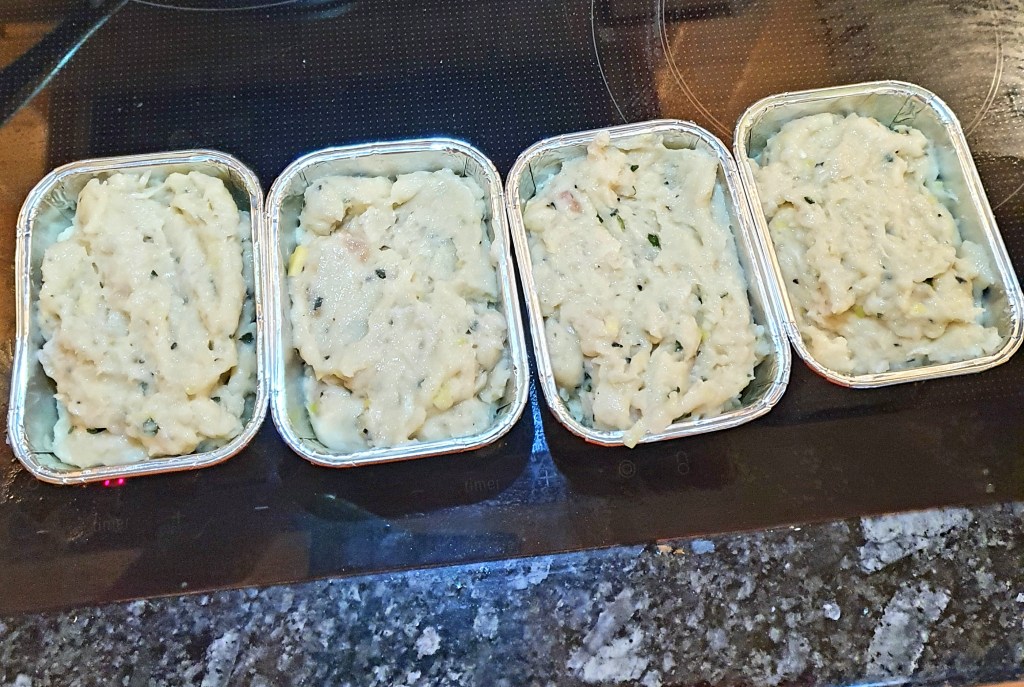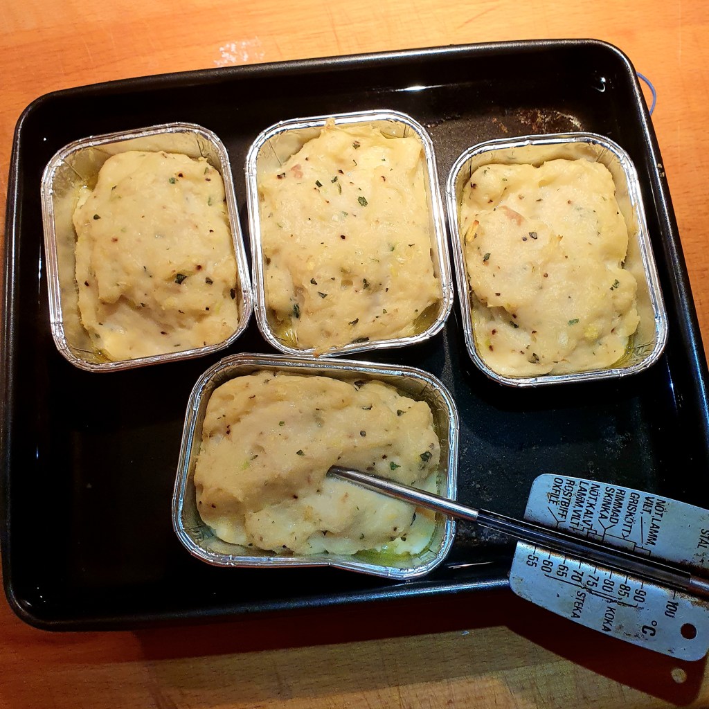 Formene ble smurt med smeltet smør. Da smøret var stivnet ble farsen fordelt i formene som ble dunket litt i benken så det ikke ble for mye luftbobler. På forhånd var en form med vann i oppvarmet i ovnen ved 180 grader C. Formene ble plassert oppi vannet og fikk bake i ca 30 minutter. Kjernetemperaturen skal være 72 grader.