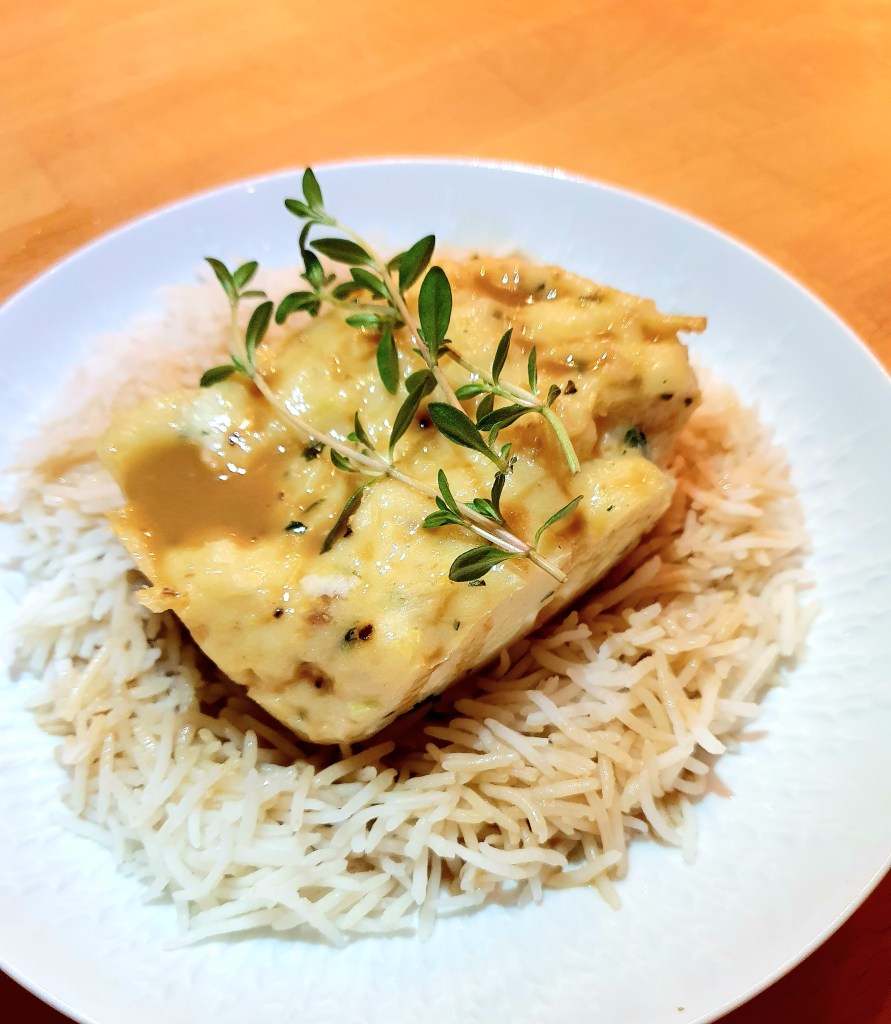 Timbalene er lette å få ut av formene. De ble denne gangen servert med kokt ris tilsatt et par spiseskjeer mirin (en litt søtlig japansk risvin som du får kjøpt feks på Meny) og en saus som var laget av redusert skalldyrkraft hvor ca 50 gram kaldt smør ble pisket inn for å runde av den litt bitre skalldyrsmaken. Det var veldig godt og jeg var superfornøyd.