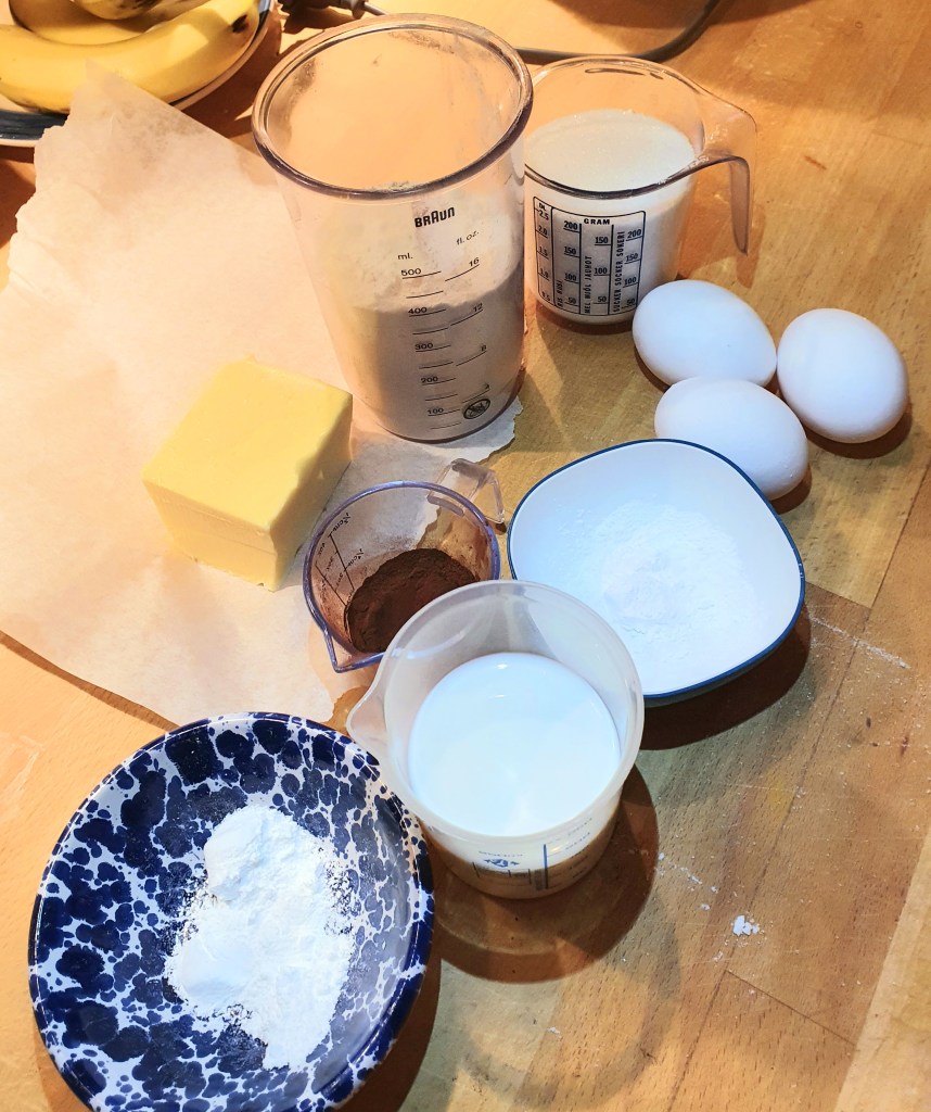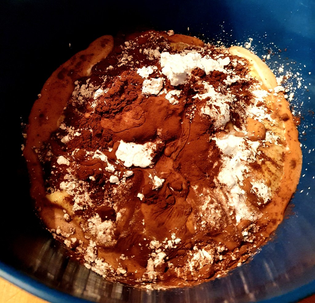 Ta litt mindre enn halvparten av røren over i en ny bolle og tilsett kakao, vaniljesukker og de to spiseskjeene med melk. Rør godt.