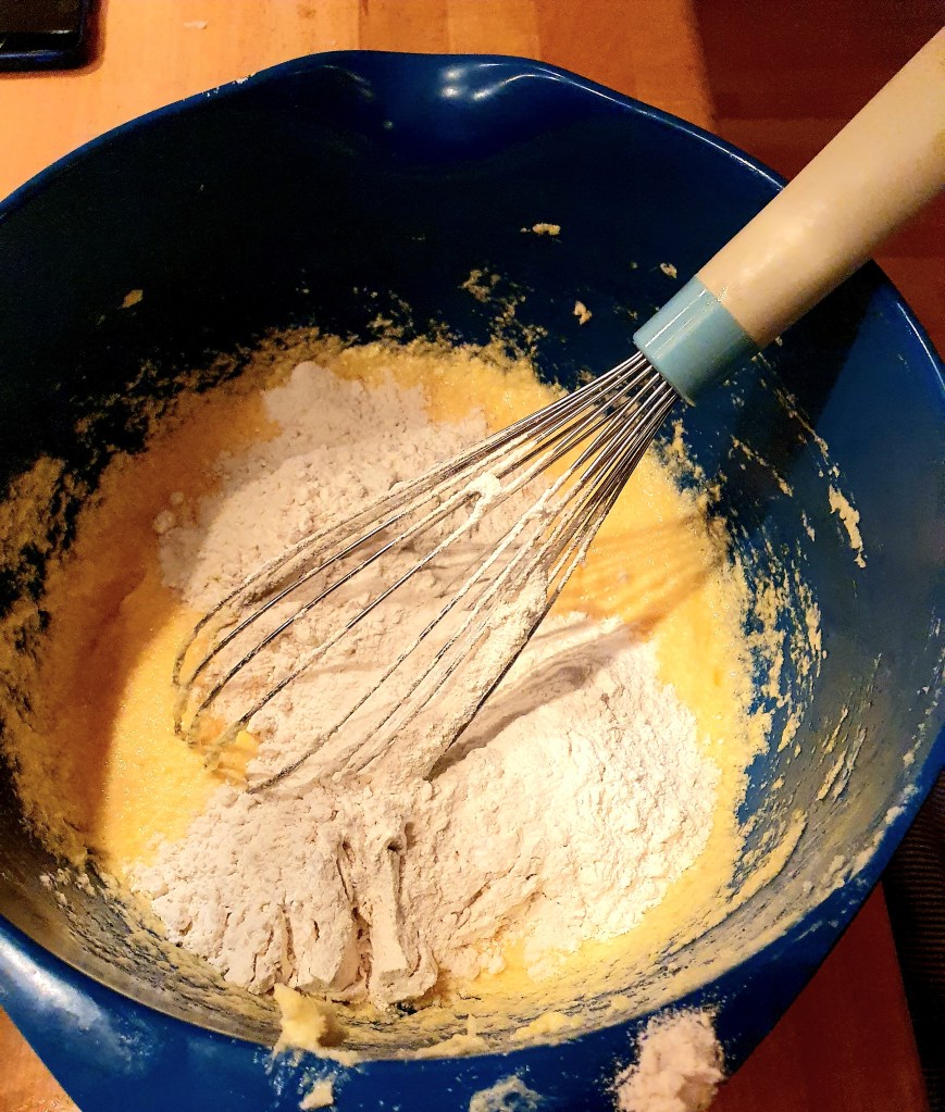 Rør inn et og et egg om gangen og bland med en visp. Bland mel og bakepulver og rør inn ca halvparten av dette i smørblandingen. Tilsett deretter melken og rør den inn. Resten av melet tilsettes så og rør deigen glatt og fin.