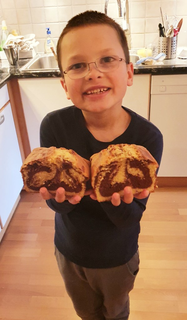 Barn syntes at marmorkake ser kul ut og det syntes Jakob også. Han kikket gjennom noen oppskrifter beregnet for barn på matstart.no og valgte ut marmorkake, mest på grunn av utseende. Det er litt morsomt å lage denne kaken hvor man har en mørk og en lys deg som legges oppå hverandre og blandes ved å dra en gaffel igjennom til slutt.