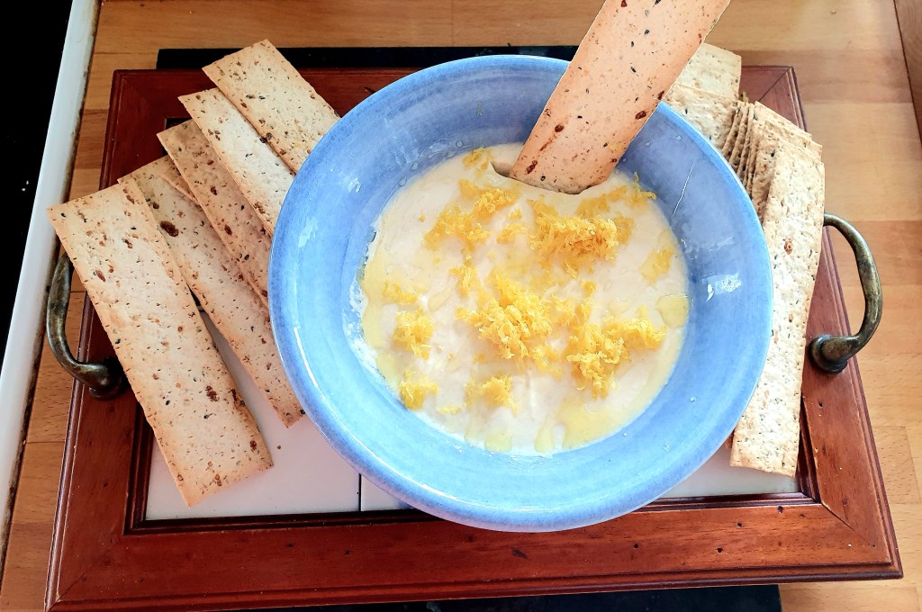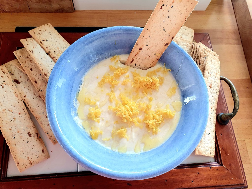 Ved servering ble sitronskallet drysset over dippen og noen dråper olivenolje ble også ringlet over. Har du gressløk kan du klippe opp noen strå og ha over.