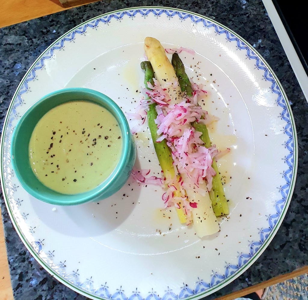 Skrell aspargesene og brekk av den nederste delen. Stilken på de hvite aspargesene skrelles helt og helst 2 ganger mens de grønne bare skrelles helt nederst. Kok de hvite aspargesene ca 5 minutter i vann tilsatt en klype sukker, 1 teskje salt og 1 spiseskje hvitvinseddik. Når det er 2 minutt igjen av koketiden tilsettes de grønne aspargesene som får koke med det siste minuttet. La aspargesene renne av på et kjøkkenhåndkle.