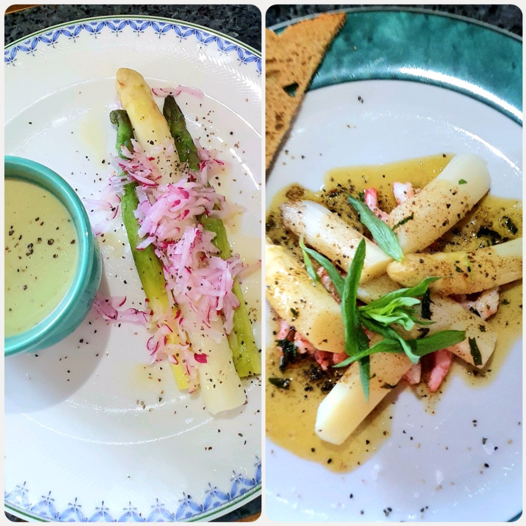 Aspargessesongen er på hell. Her kommer to oppskrifter til forrett eller en smårett sånn i siste liten. Resten av året kan du selvsagt bruke grønne asparges eller grønne aspargestopper.