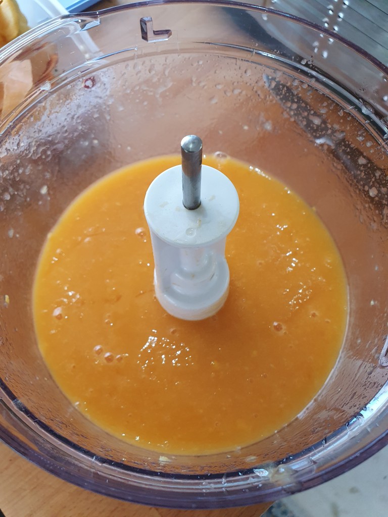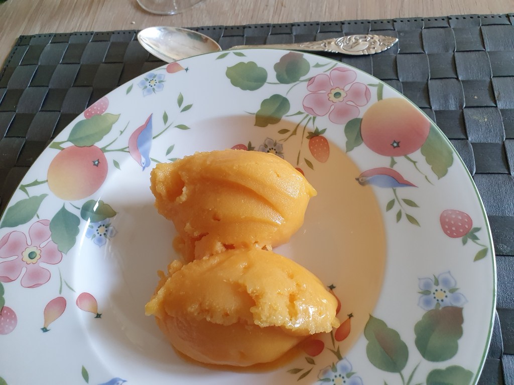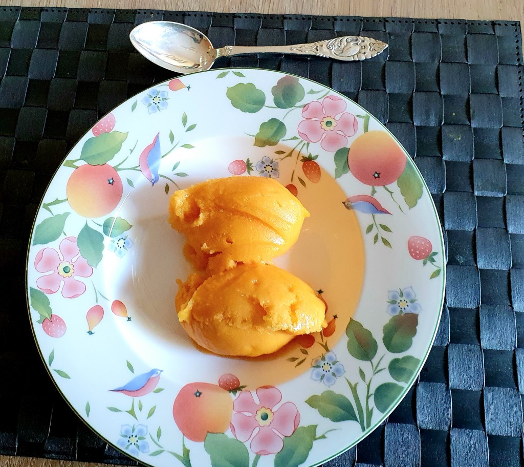 Nå er det høysesong for pakistanske mango som det finnes mengder av i innvandrerbutikker. Den ser anderledes ut enn den vi vanligvis får tak i som kommer fra Sør-Amerika. Den pakistanske mangoen er gul utenpå og inni og skinnet er litt loddent. Fruktkjøttet er mykt og søtt og egner seg veldig til å lage is av eller som her, sorbét.
