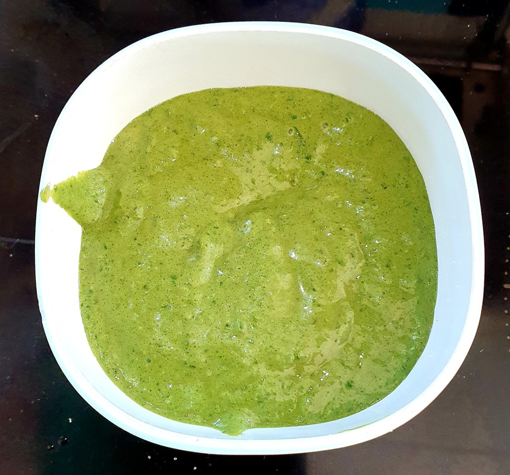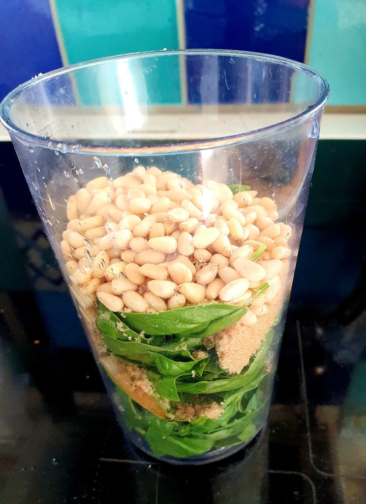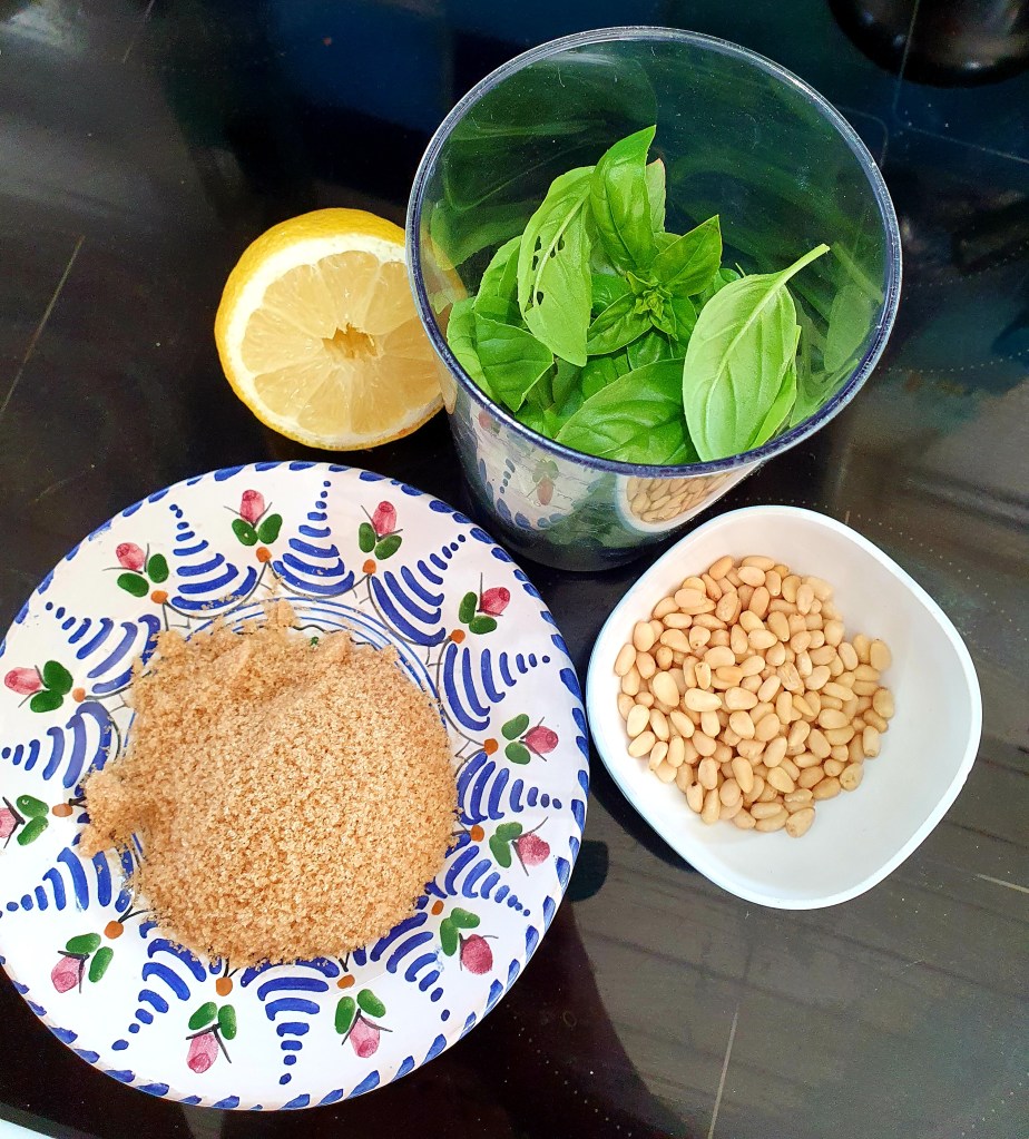 Basilikumblader tilsvarende 1/2 potte av en slik som du kjøper i butikken, blandes sammen med 50 gram brunt sukker og ca 25 gram ristede pinjekjerner i et høyt beger. Saften fra ca 1/4 sitron tilsettes. Med en stavmikser blender du alt til det blir en fin krem. Syntes du det blir for tykt kan du tynne med noen dråper vann.