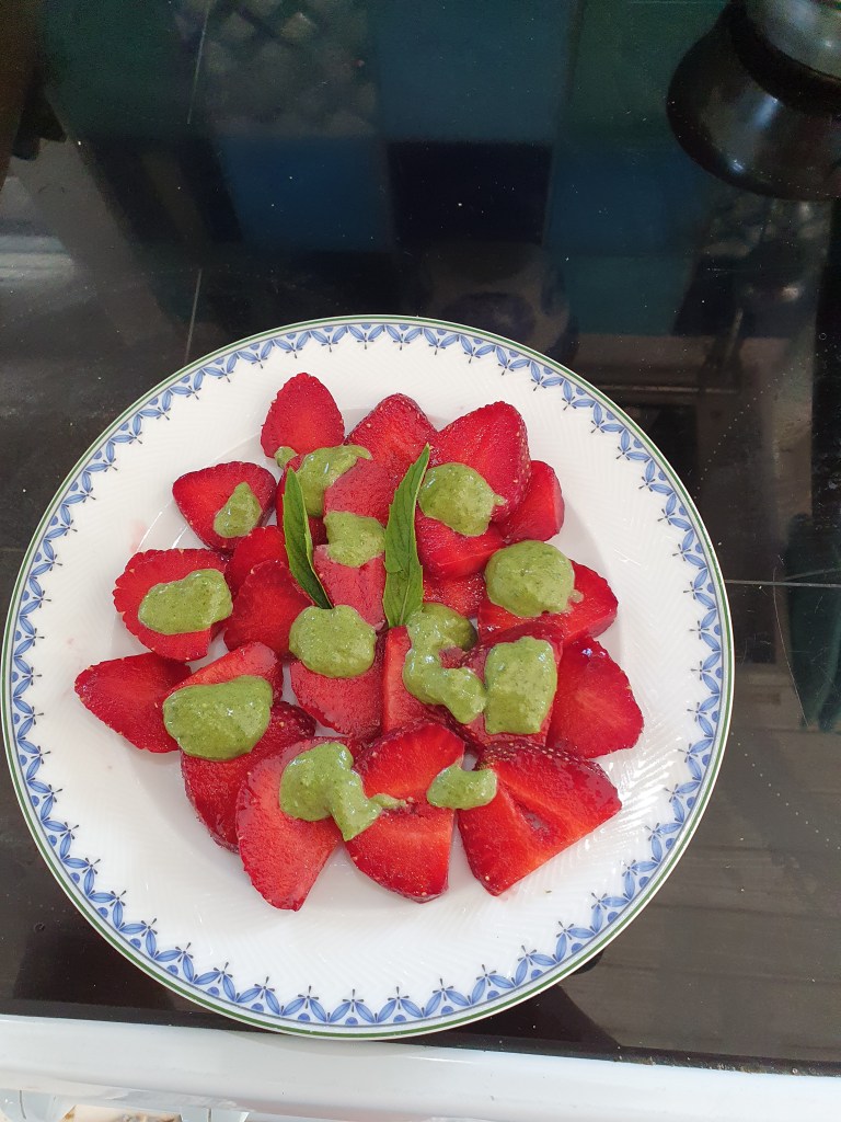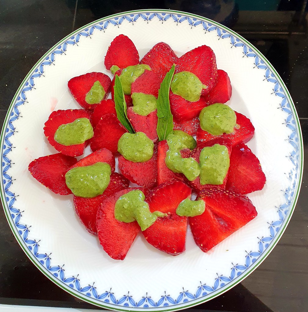 Her har jeg skåret jordbærene i skiver og fordelt klatter med pesto over. Kjempegodt!! Dryss gjerne litt grov pepper over…