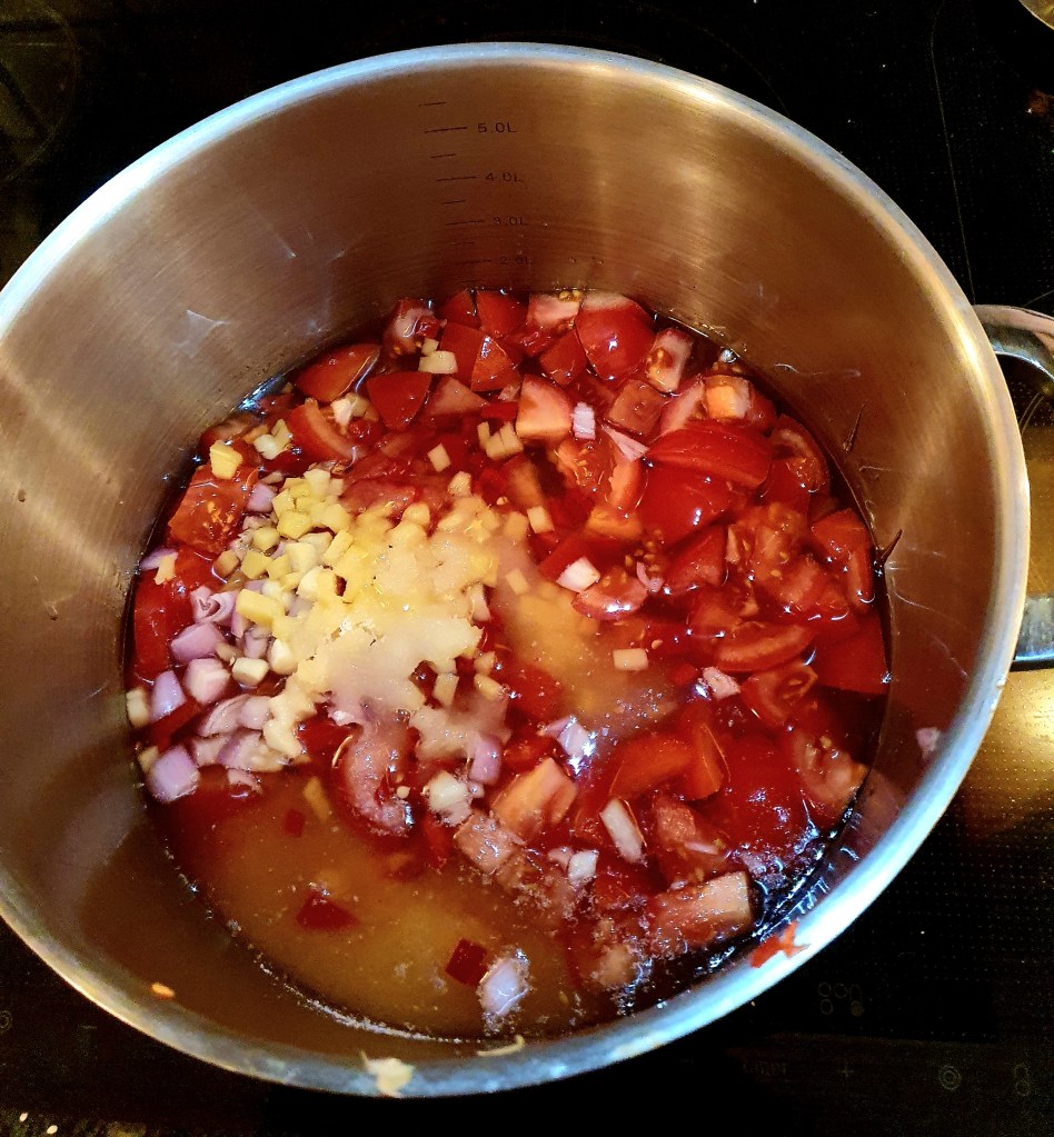 4 tomater ble delt i 4 og stilkfestene ble fjernet. Deretter ble tomatene delt i mindre biter. 1 sjalottløk og 1/2 kinesisk hvitløk ble renset og finhakket. Det samme ble gjort med 2 store chili og ca 2 cm med fersk ingefær. Jeg fjernet frøene i chiliene, men liker du det mer hot, kan du beholde dem. Alt ble plassert i en gryte sammen med 2 dl sukker, 1 dl eplesidereddik, 1 dl vann og 1 dl lys sirup. Kokte opp blandingen og lot massen koke videre i ca 2 timer under lokk. Før sausen ble helt på flasker fikk den en omgang med stavmikseren.