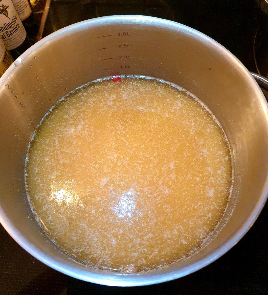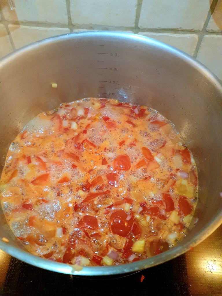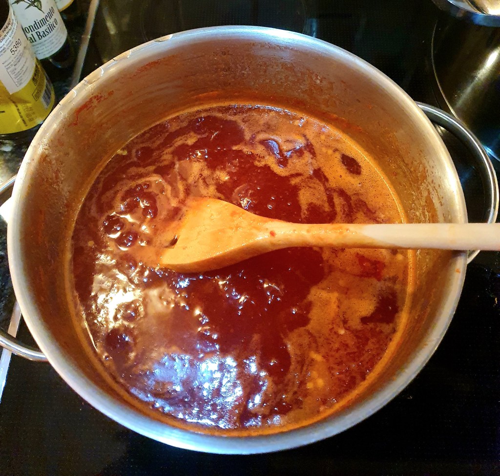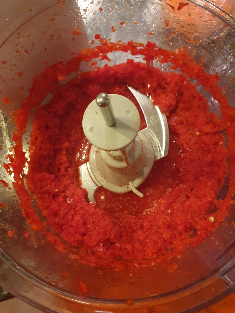 150 gram renset chili uten frø og 150 gram renset rød paprike ble kjørt til en fin masse i en foodprosessor. 1 kilo syltesukker (inneholder pektin) og 6 dl eplesidereddik ble kokt opp i en gryte. Chili/paprikamassen ble tilsatt og blandingen fikk koke i ca 10 minutter. Gryten ble så tatt av varmen og fikk avkjøle i 40 minutter med litt røring innimellom før marmeladen ble helt oppi rene glass. Lokk ble satt på når marmeladen var helt kald.