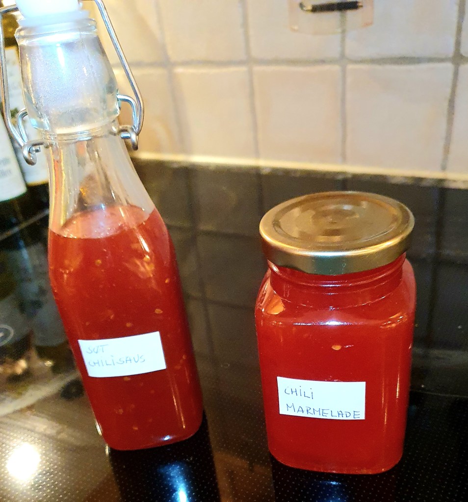 I sommer fikk vi i gave et par chiliplanter fra vår venn i Horten som hver januar fyller de fleste vinduskarmene i sitt store hus med frø av alskens slag. Begge chiliplantene ga store avlinger av røde chili og da passet det fint å lage både en marmelade og en søt chili saus. Marmeladeoppskriften fant jeg på detsoteliv.no og oppskriften på sausen på vegetarbloggen.no. Begge oppskriftene er lettvinte men tar litt tid.