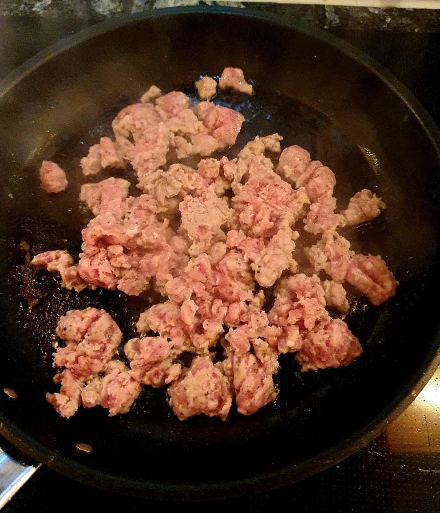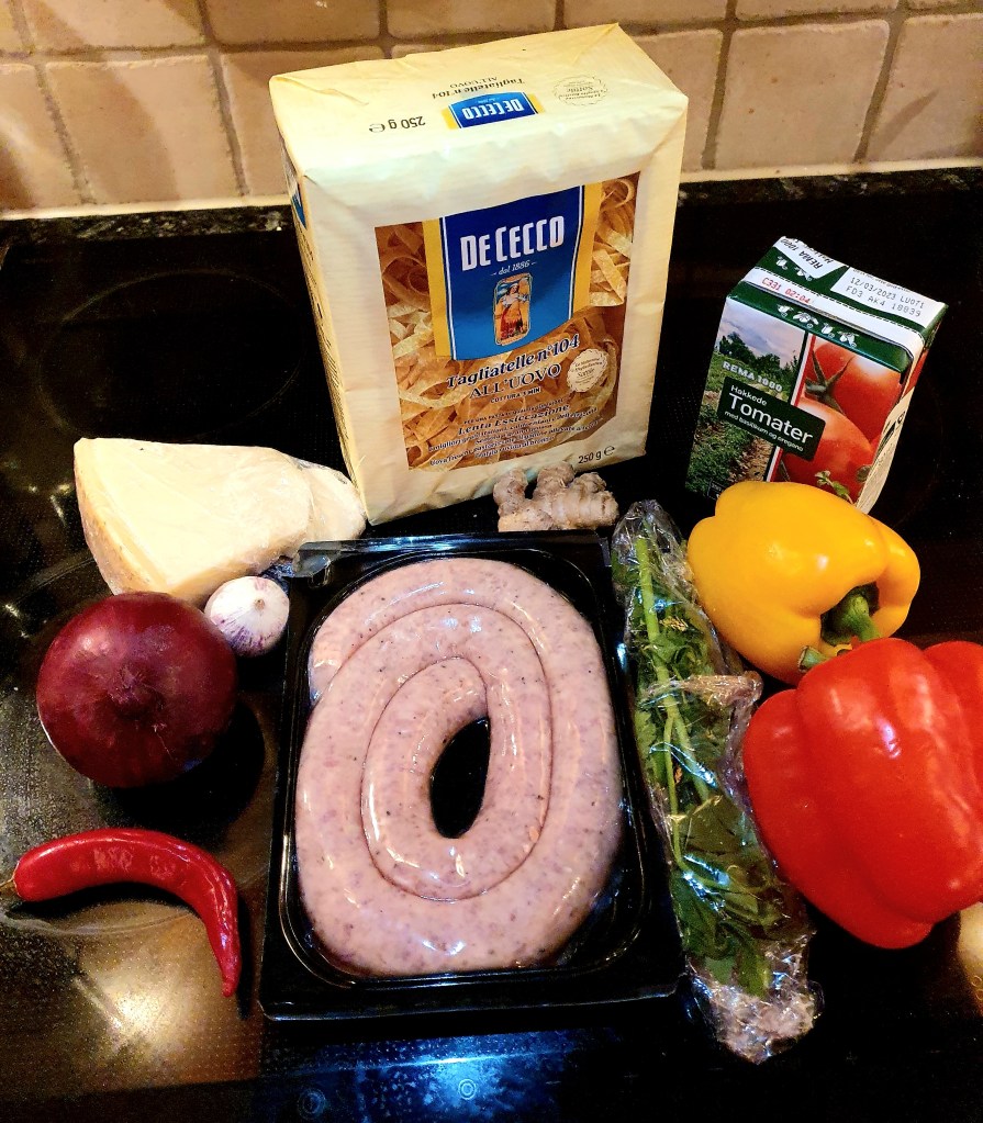 Salsiccia er en rå italiensk pølse som er laget av svin or urter, noen er også krydret med fennikel. Den kan stekes eller grilles hel eller man kan bare benytte farsen slik som her. Når du steker farsen så strømmer det ut nydelige urte og krydderdufter og du gleder deg til å spise. Retten kan lages med alle typer pasta, ikke bare båndspagetti som her.