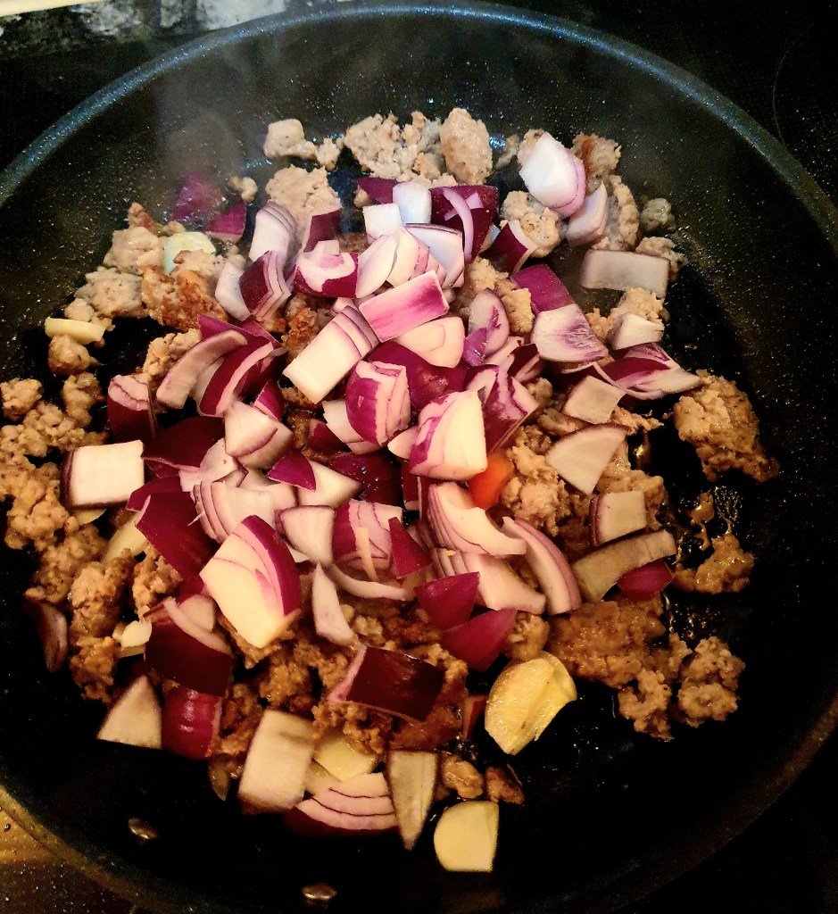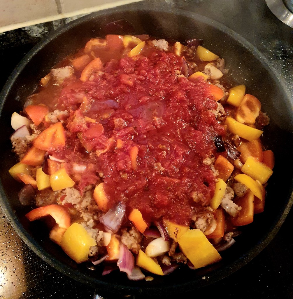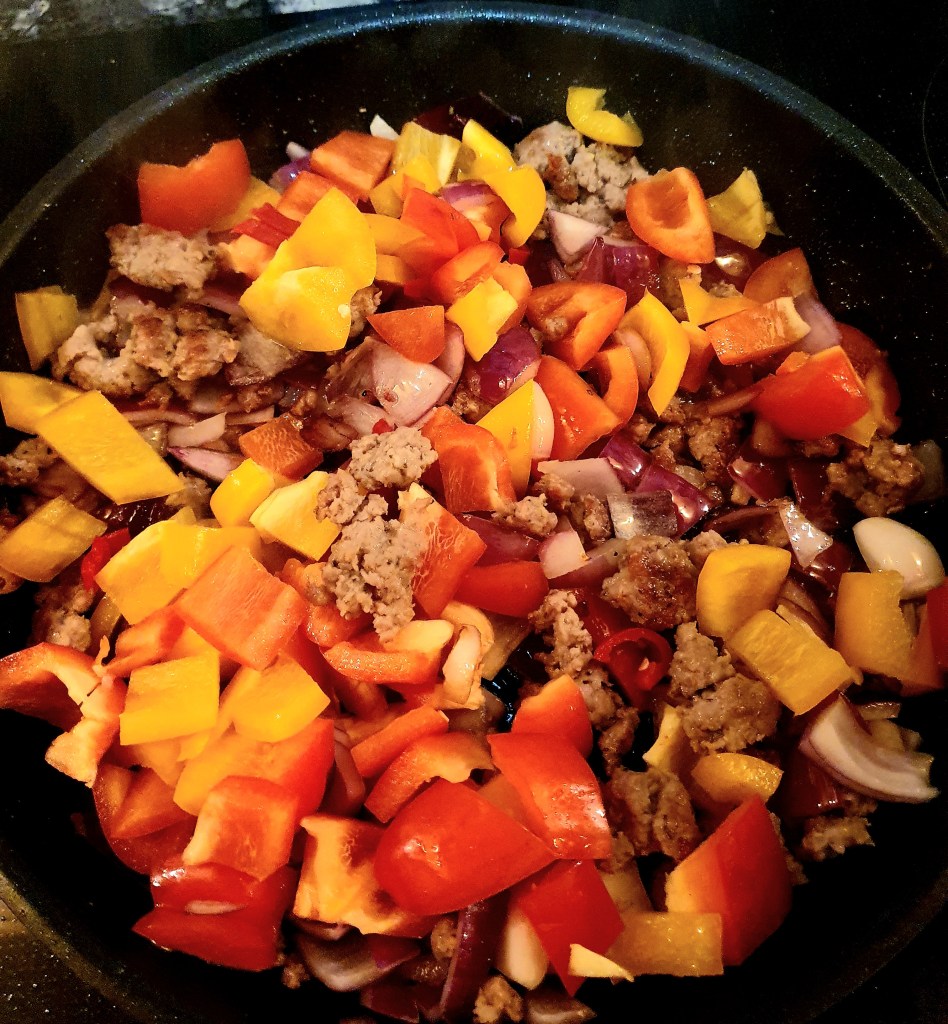 Trykket ut farsen fra pølsetarmen og stekte den i olje på en varm panne. Delte den opp i mindre biter. Skrudde ned varmen litt og tilsatte skiver av hvitløk som ble stekt med et par minutter. Deretter ble løken tilsatt og fikk steke i 2-3 minutter før paprika og chili ble tilsatt og igjen fikk alt steke i ca 3 minutter før tomatene og revet ingefær ble tilsatt. Alt ble blandet godt og sausen fikk koke ved middels varme for at paprikaene skulle bli mør og alle smakene sette seg.