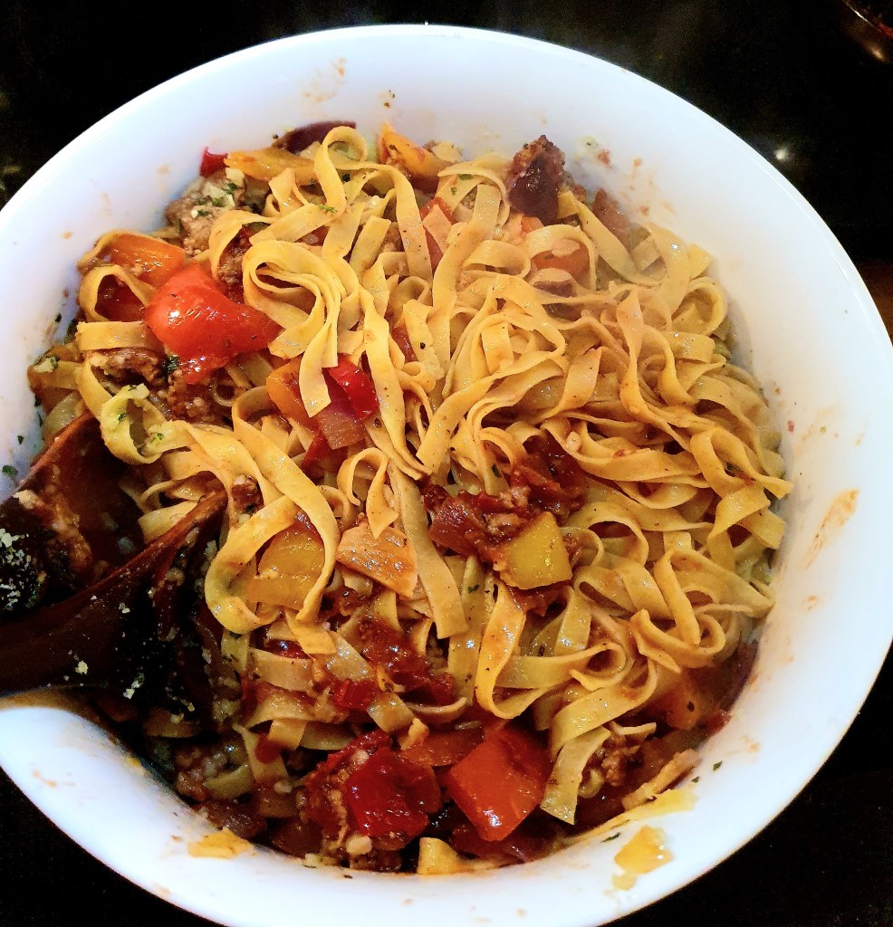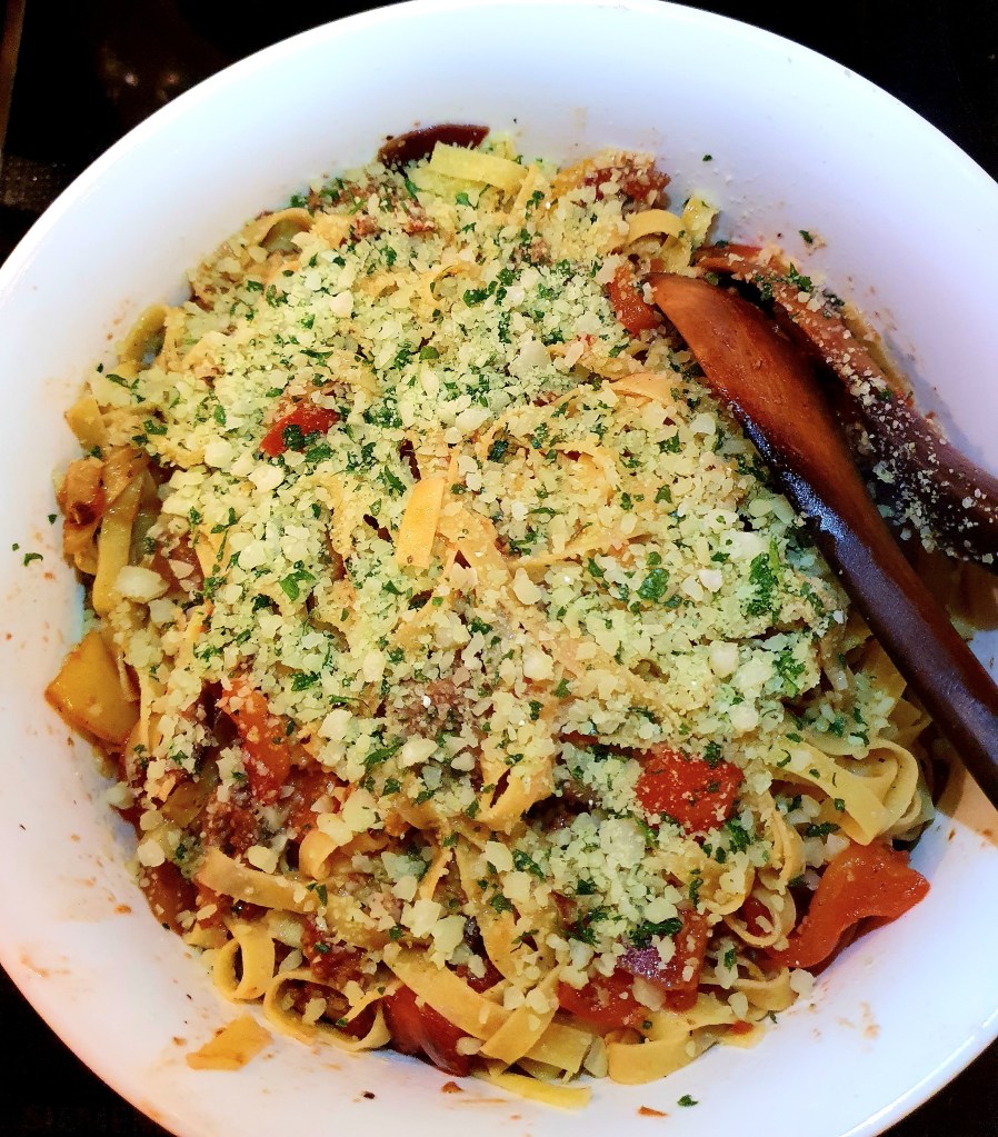 Da pastaen var ferdigkokt ble vannet helt av (tok vare på et par dl). Sausen ble overført til en stor skål og pastaen ble blandet godt inn. Tilsatte litt av pastavannet fordi sausen hadde kokt inn litt og blandet igjen. Tilslutt ble ost og persilleblandingen rørt inn.