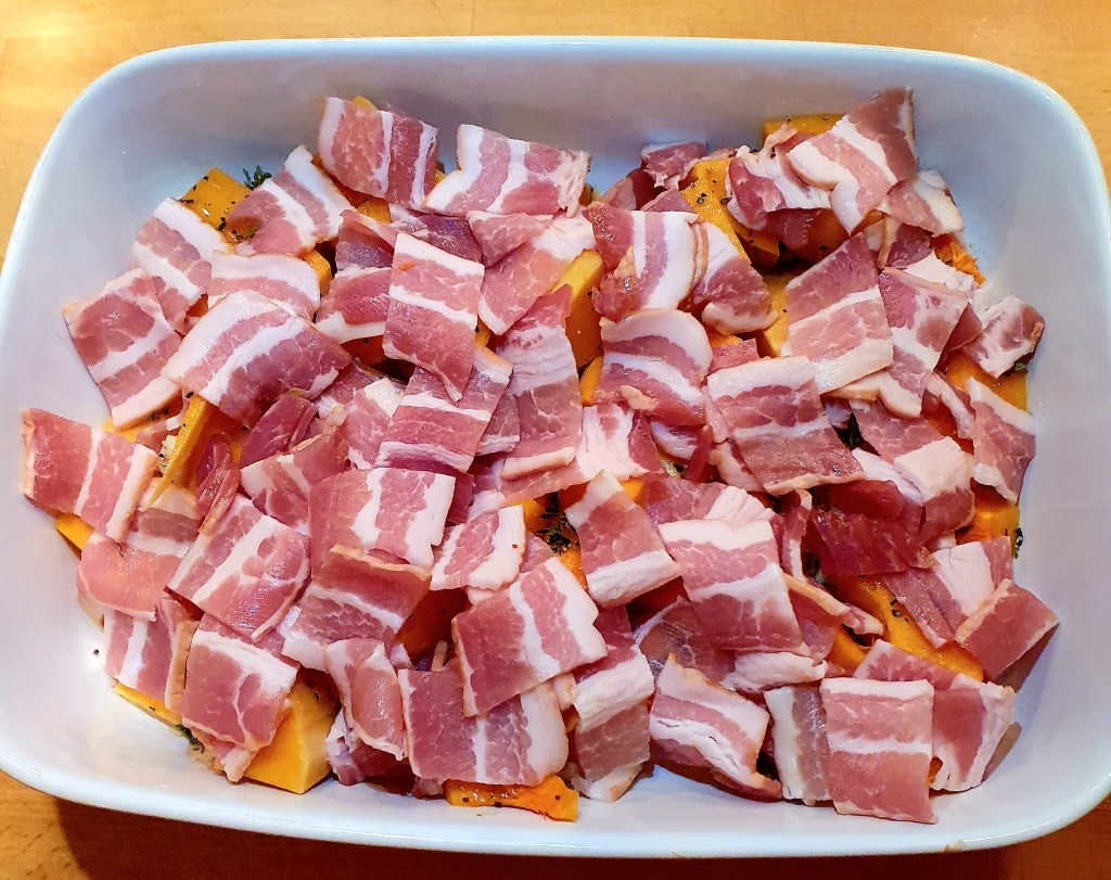 Gresskaret ble skrelt og delt i to. Frøene ble fjernet og kjøttet ble skåret i biter, ca 2-3 cm. Bitene ble lagt i en ildfast form sammen med hvitløken og timian. Olje, salt og grov pepper ble tilsatt og alt ble blandet godt med hendene. Baconbitene ble lagt på toppen.