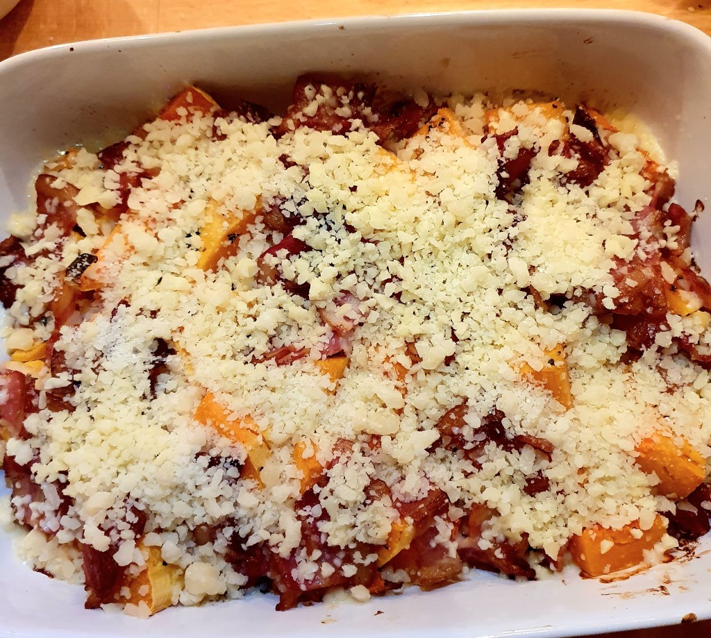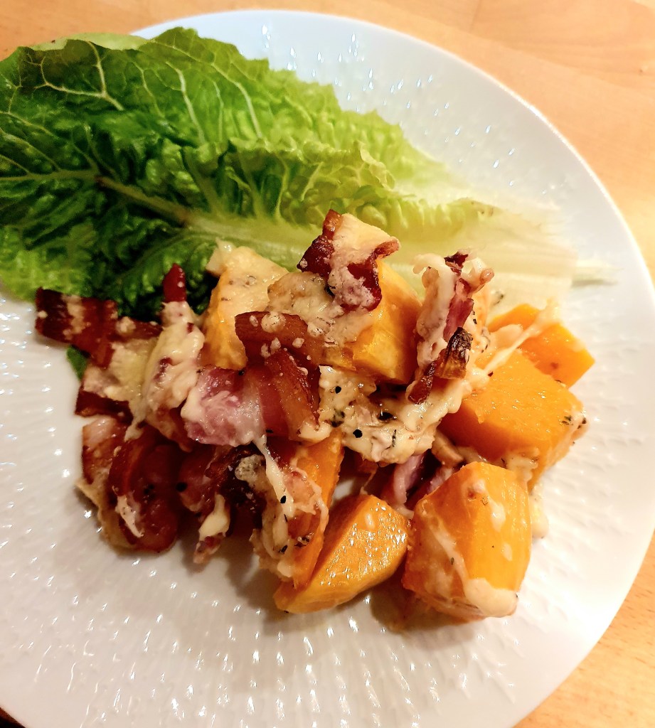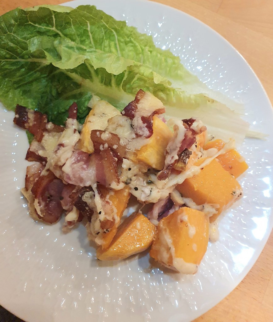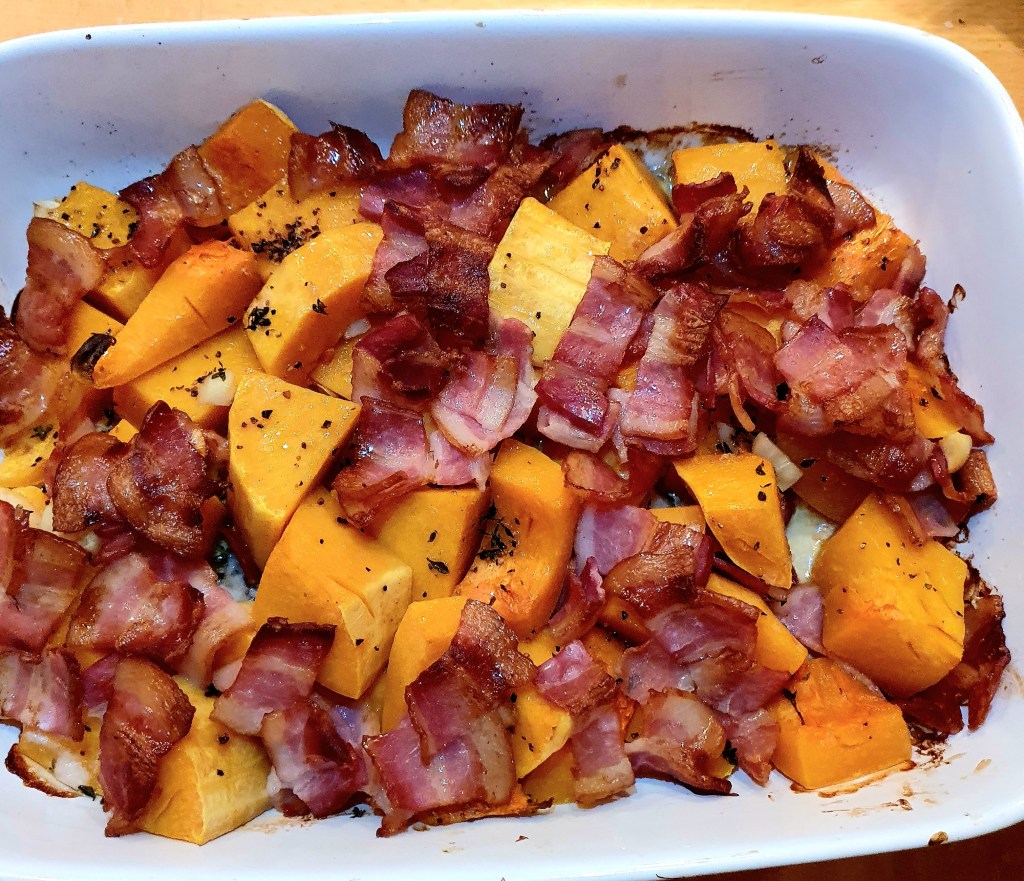 En utrolig smakfull rett- sødmen fra både gresskaret og baconet kombinert med salt fra osten- det kan nesten ikke bli bedre. Lettvint er det også- en grønn salat med ristede pinjekjerner vil nok være godt ved siden av.