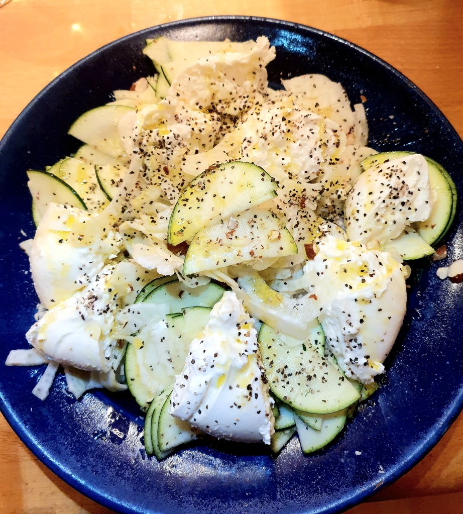 Burrata- har du smakt burrata vil du aldri kjøpe mozarella igjen (jo, kanskje mozarella laget av bøffelmelk). Burrata er en fersk ost fra sør-Italia som ser ut som en liten kule med en mindre kule på toppen. Inni er massen myk og fløyelsaktig med en lett syrlig smak og man må bare nyte og nyte. Om sommeren er det burrata med tomater og olje og kanskje basilikum som gjelder- mer trenger man ikke. Her serveres osten sammen med rå fennikel og tynne squashskiver.