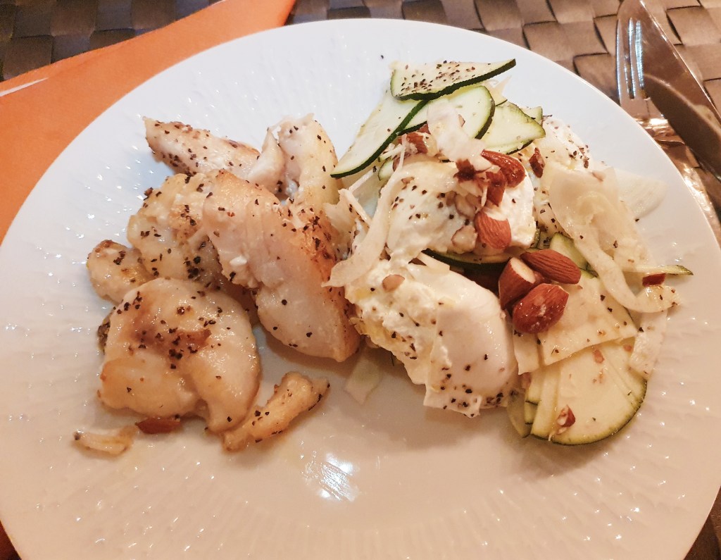 Salaten ble laget ved å skjære en fennikel og squash i tynne skiver på en mandolin. Dette ble fordelt utover et fat, osten ble delt i biter og lagt innimellom. Hakkede mandler ble drysset over. Dressingen var en olivenolje med sitron blandet med litt hvitvinseddik litt salt og grov pepper.