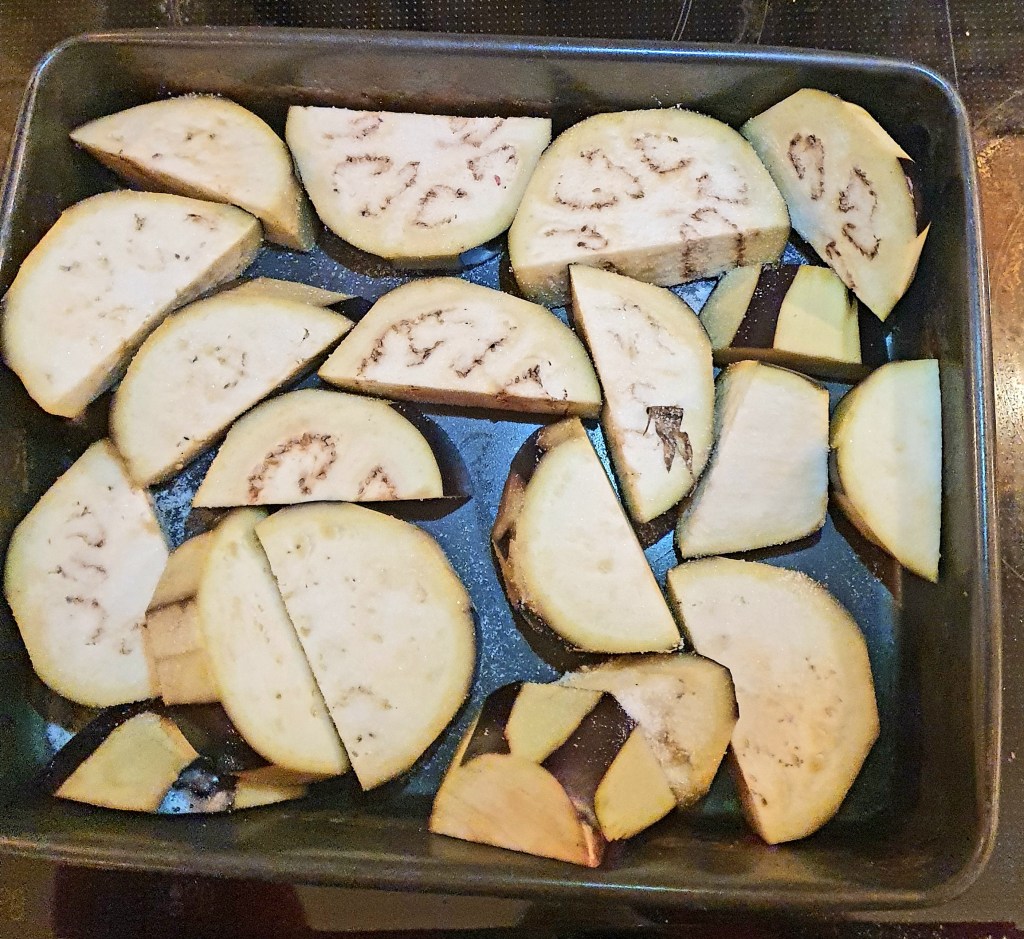 Auberginene ble delvis skrelt, delt i to og deretter skåret i ca 2 cm tykke biter. Bitene ble blandet med 1-2 teskjeer salt for å trekke ut bitterstoffer. Etter 15 minutter ble de skylt og plassert på et kjøkkenhåndkle for å tørke litt før de ble bakt i ovnen ved 220 grader C i ca 30 minutter. Åpnet ikke ovnsdøren før jeg kjente på dem etter 30 minutter slik at de ble bakt i sin egen damp.
