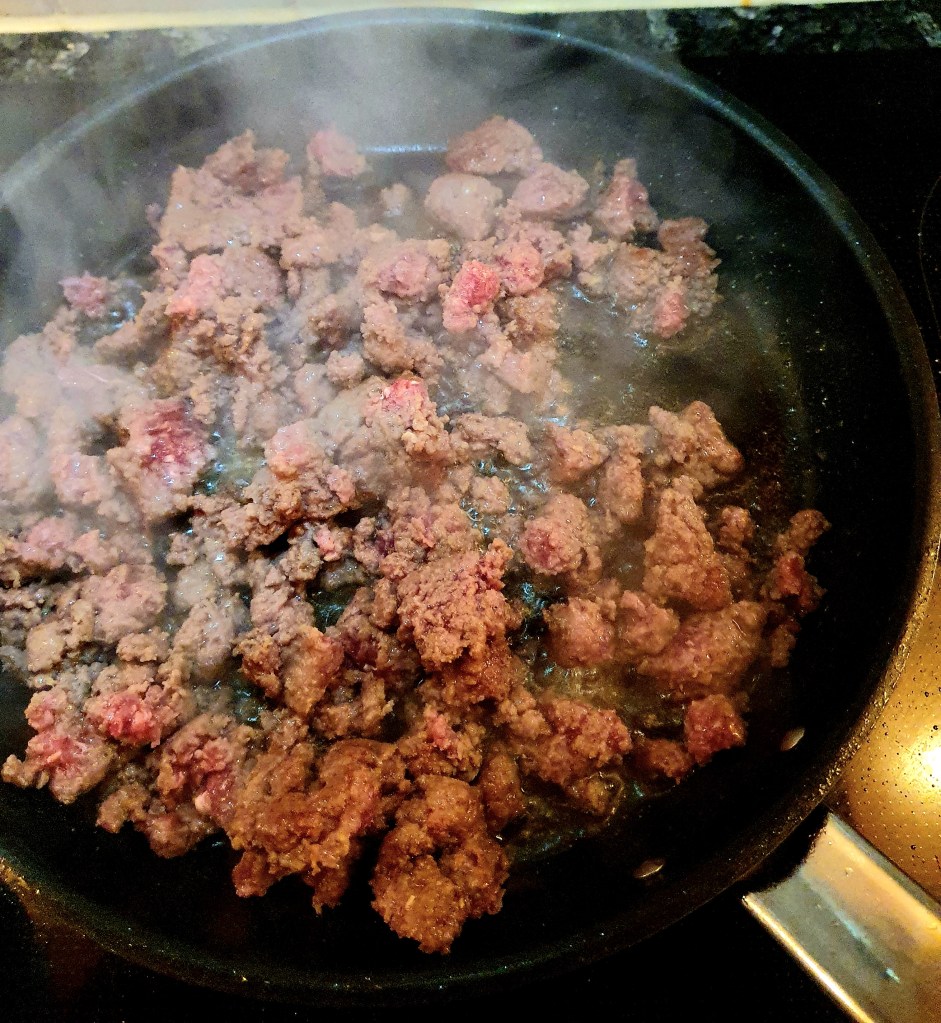 Kjøttdeigen ble delt i grove stykker og brunet i olje på en panne ved sterk varme og så overført til en stor gryte. Løken som var grovhakket, ble surret i den samme pannen i 6-8 minutter til den var myk. Deretter ble tomatpure og chiliflak rørt raskt inn før tomatene som var grovhakket, ble tilsatt. Dette fikk steke raskt i et par minutter.