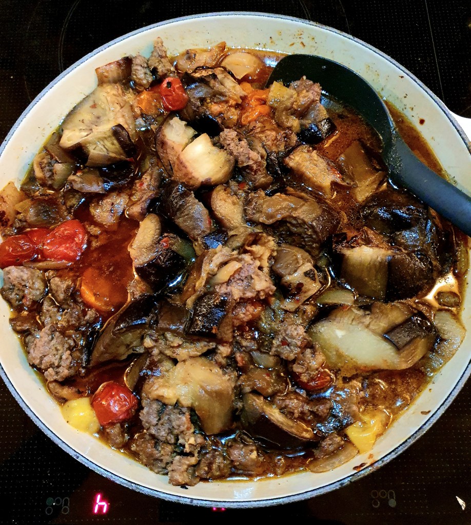 Alt ble overført til gryten med kjøttdeigen og nok vann ble tilsatt slik at det dekket kjøttet. Auberginebitene fra ovnen ble vendt forsiktig inn.