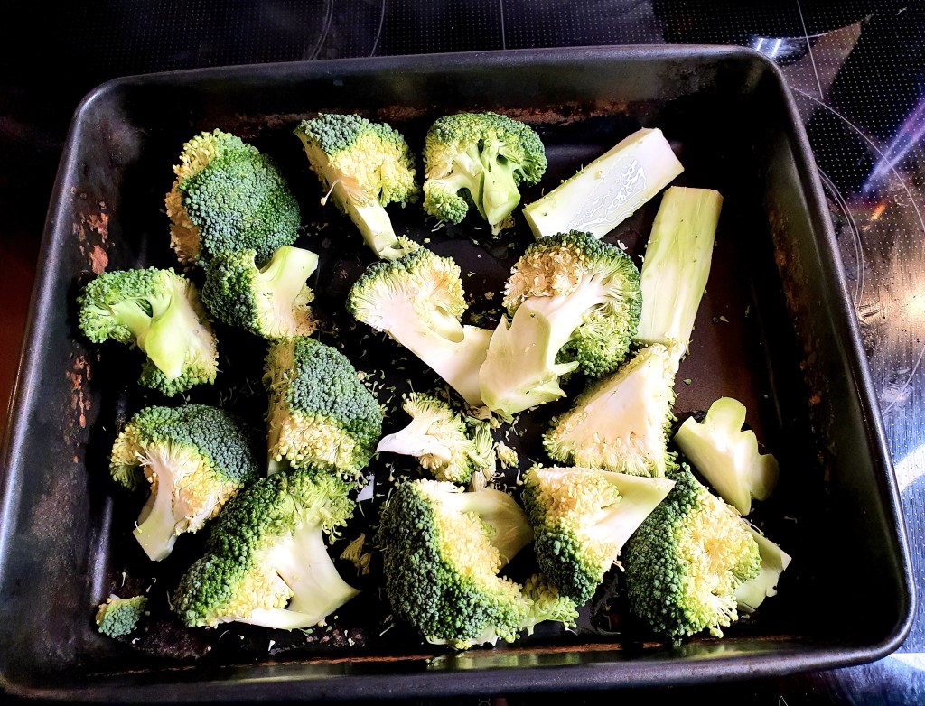 Brokkolien ble delt i grove biter og stekt i ovnen ved 205 grader i 30 minutter. Den skal få farge men ikke brenne.
