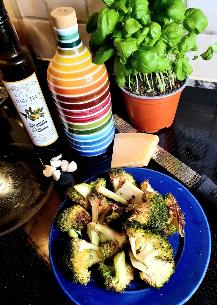 Den første middagen med kjøttbollene var ikke med tomatsaus som kanskje er det mest italienske valget, men med pasta og en pesto laget av ovnsstekt brokkoli, en pesto uten nøtter. Den ovnstekte brokkolien får en fin smak av nøtter og blir en nydelig erstatning for den mer tradisjonelle pestoen. Kjekt hvis man skal servere til noen med nøtteallergi.