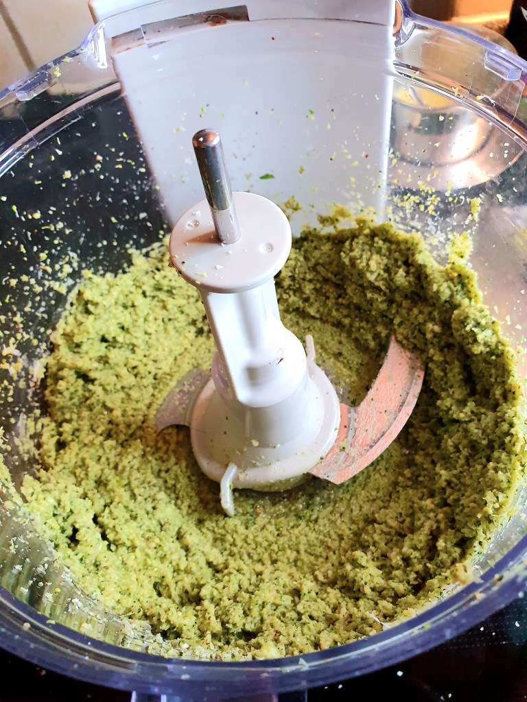Den stekte brokkolien ble blendet med basilikum, hvitløk (du kan gjerne ta litt mindre hvitløk hvis du ikke vil ha så sterk smak) og parmesan. Tilsatte oljen etterhvert til passe konsistens. Pestoen må ikke bli for tørr.
