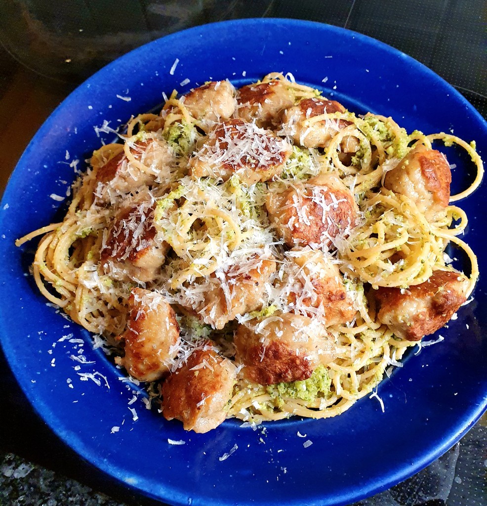Fullkornspagetti ble kokt etter anvisning på pakken og kjøttbollene ble varmet på pannen. Pesto ble blandet i den kokte spagettien sammen med kjøttbollene (har du for mye pesto kan du oppbevare den i kjøleskapet med olje på toppen eller du kan fryse den). Parmesan ble revet over