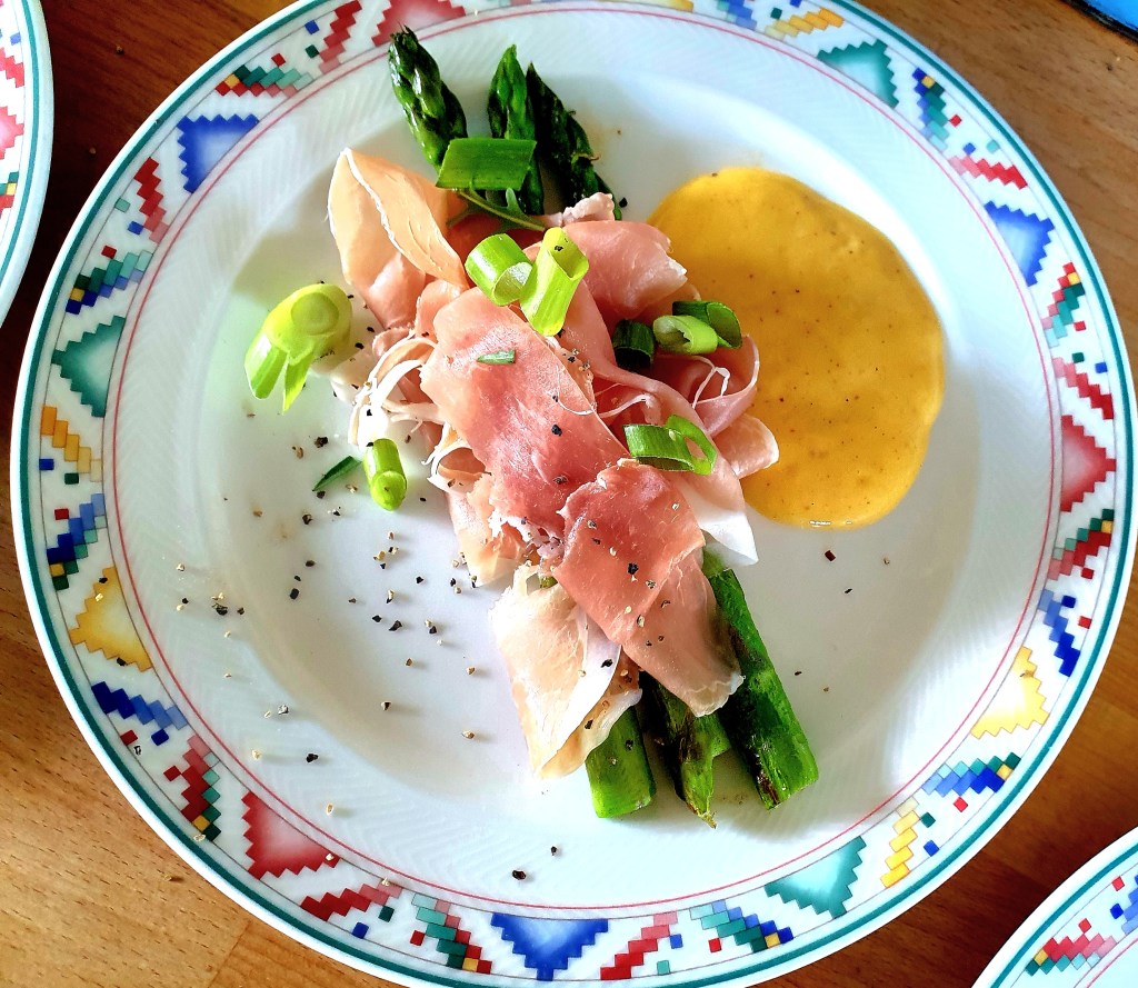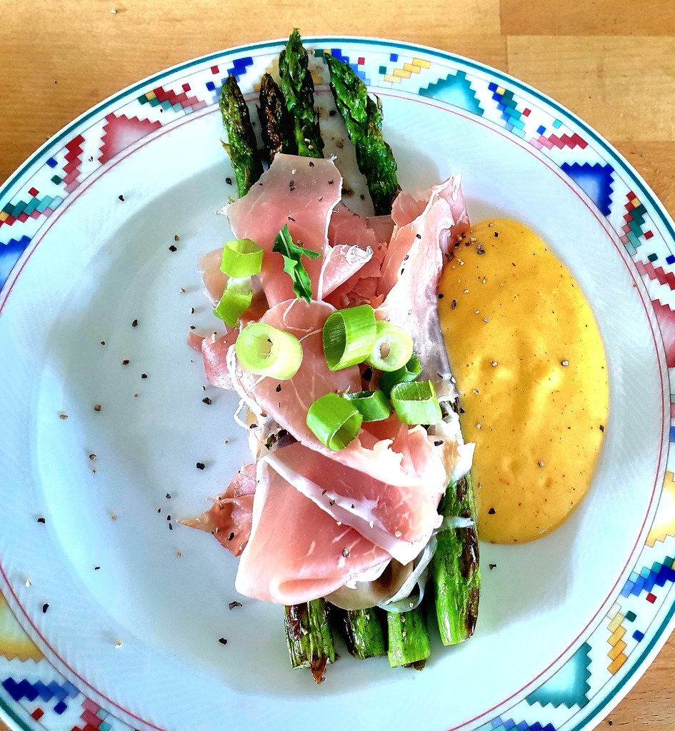 Fjern den nederste delen av aspargesene og stek dem raskt på en varm panne i en blading av smør og olje. Plasser dem på porsjonstallerkener, legg en raus haug av tynnskåret spekeskinke oppå og dryss med finskåret vårløk. Legg sausen ved siden av. Godt brød passer her. Utrolig god og smaksrik forrett.