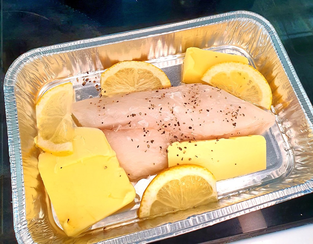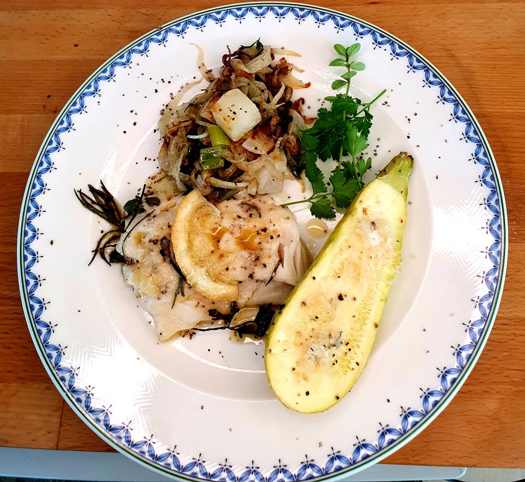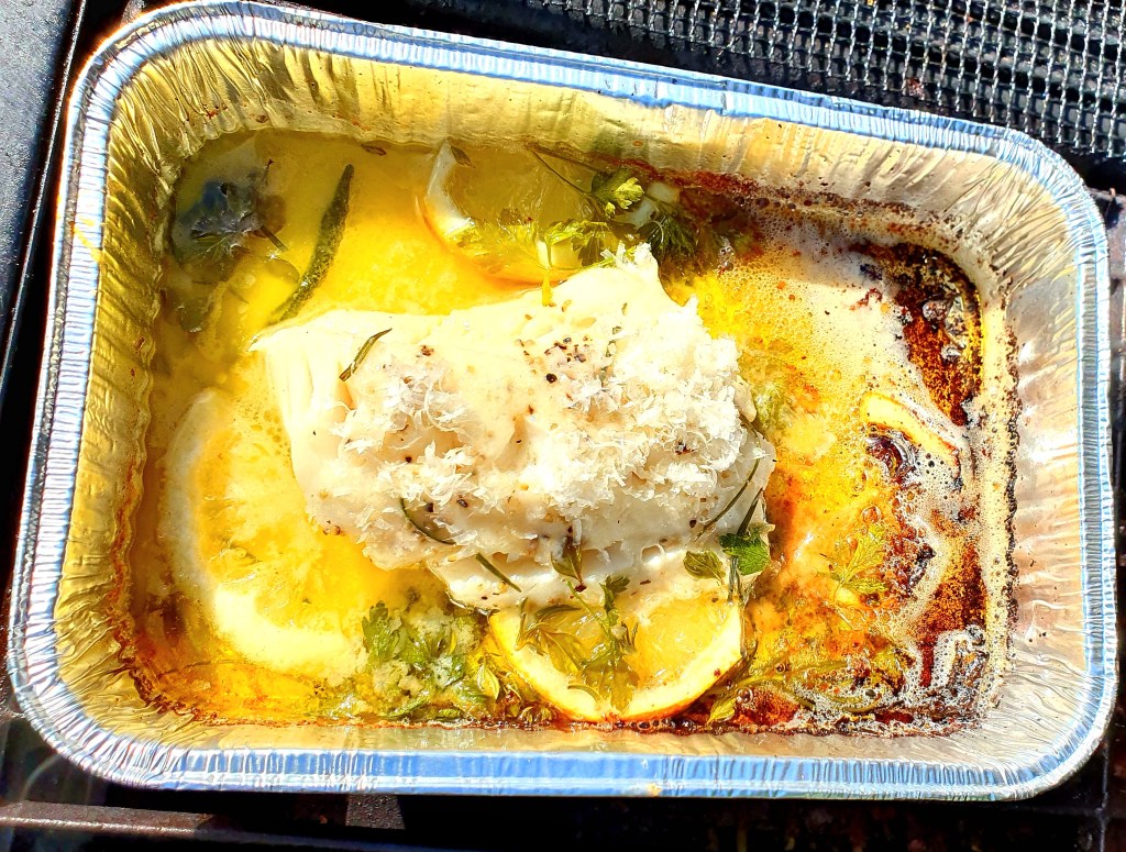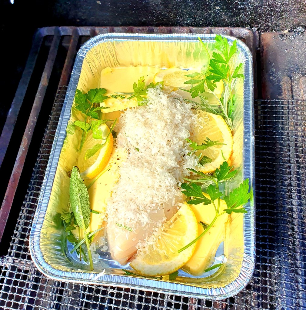 Bunnen av en aluminiumsform ble dekket av et tynt lag rapsolje. Fiskefileten (ca 200 gram) ble lagt oppå sammen med noen gode klatter smør, noen skiver sitron og salt og grov pepper. Fisken ble dekket av revet parmesan og storbladet persille og litt salvie ble fordelt over hele formen. Formen ble satt på den varme delen av grillen med en tom form over som lokk.