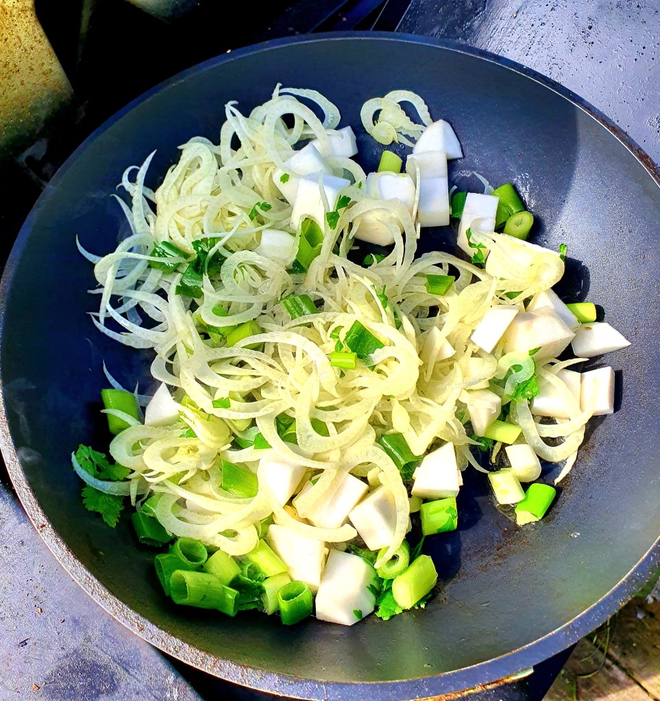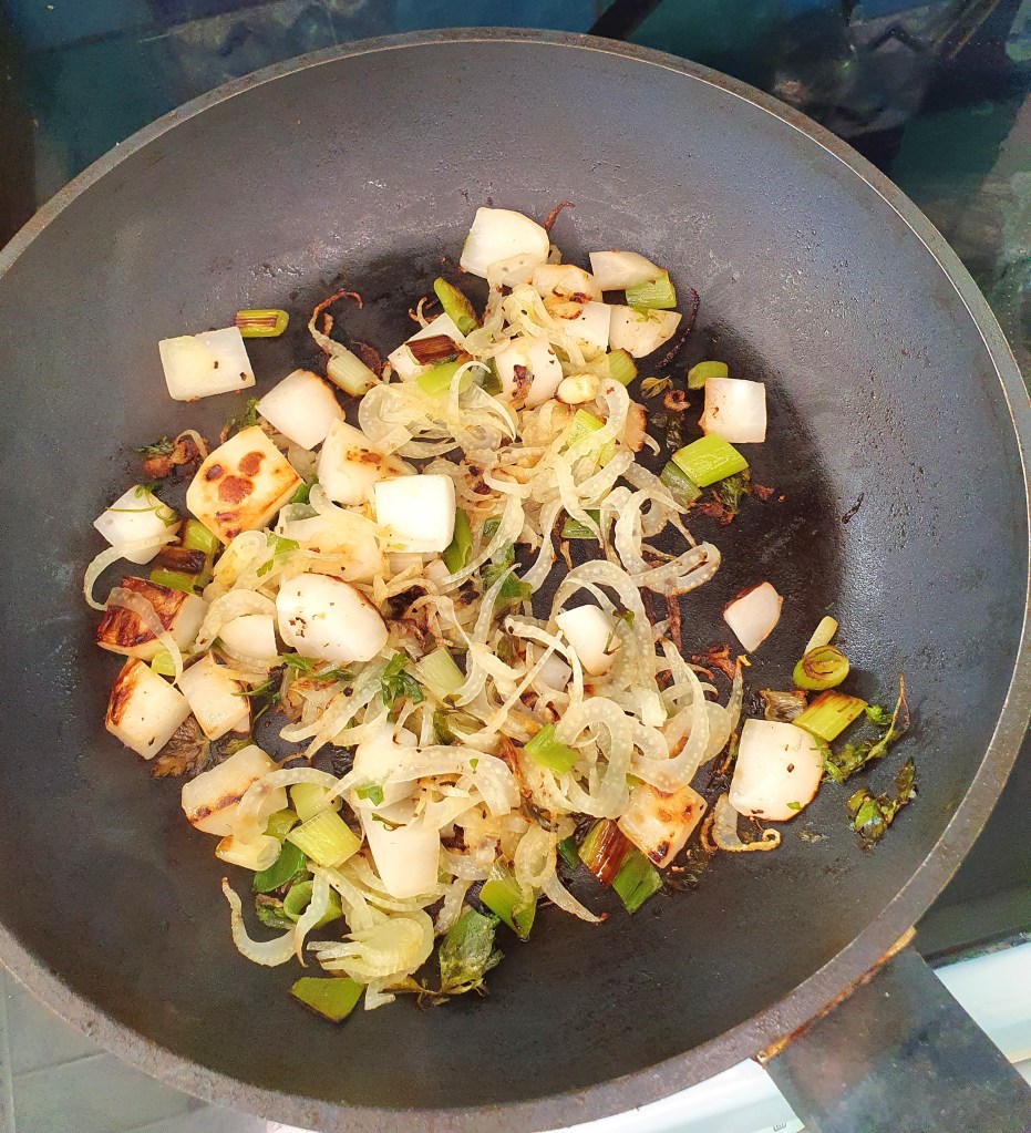 I mellomtiden stekte jeg grønne og hvite grønnsaker- en nepe, et par vårløk og tynne skiver av en liten fennikel (helst skåret på mandolin). Grønnsakene ble stekt i en blanding av smør og olje og de skal ha litt farge. Smakte til med flaksalt og grov pepper.