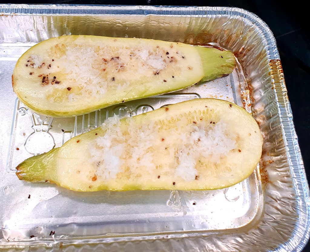 En liten squah ble delt i to og lagt i en tilsvarende aluminiumsform. Salt og pepper ble drysset over og formen ble satt i grillen like lenge som fisken. Disse ble også dekket med parmesan etter at de var ferdig grillet.