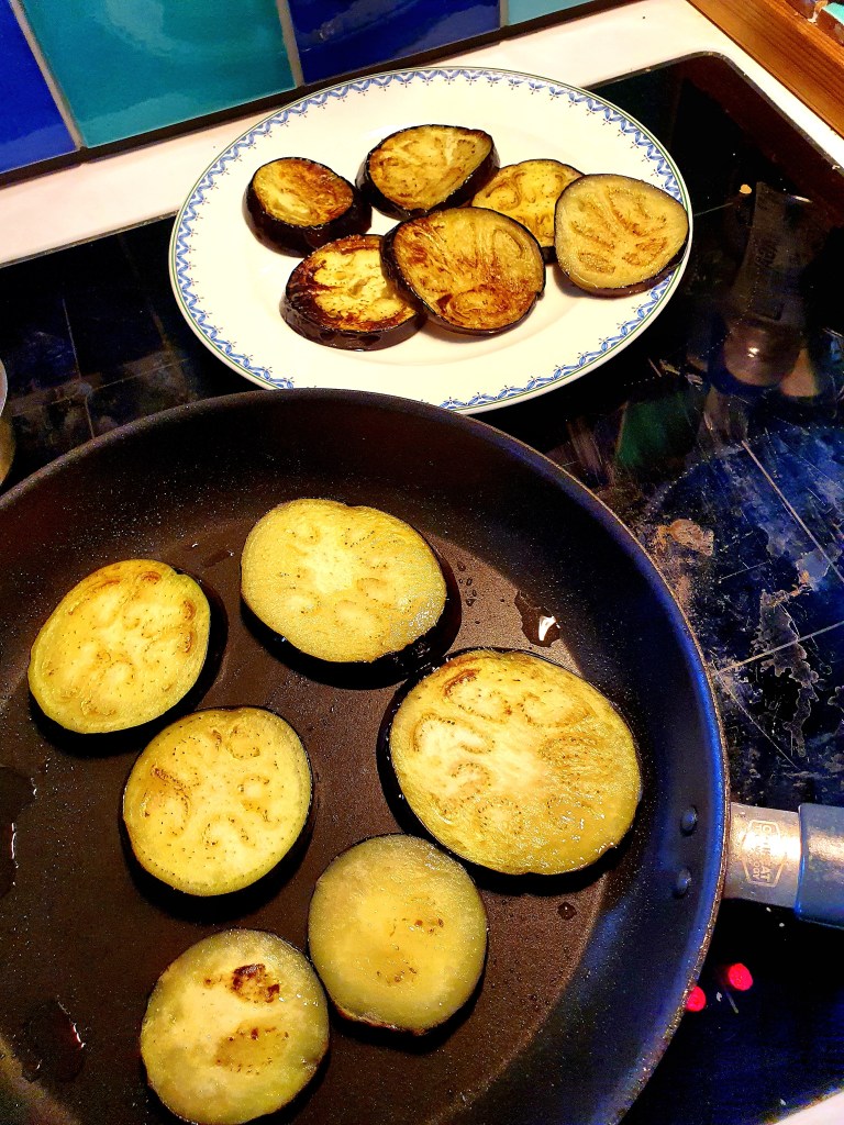 Auberginen ble delt i skiver på ca 1 cm. Disse ble stekt på begge sider i en ganske varm panne i olje til de var myke og hadde fått litt farge. Morrpølseskivene ble stekt ved høy varme i en tørr panne til de slapp endel fett og ble litt sprø (de blir ikke knasende sprø).