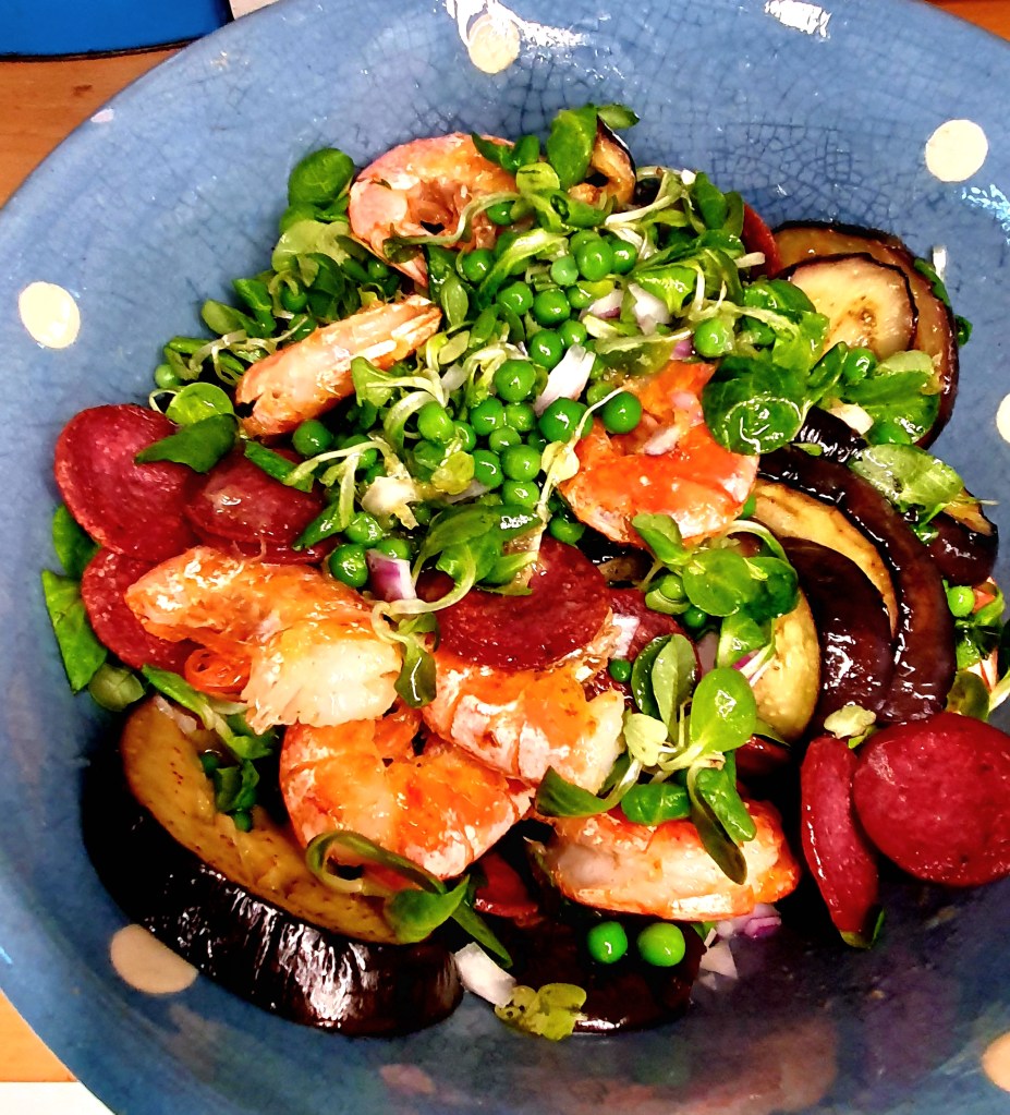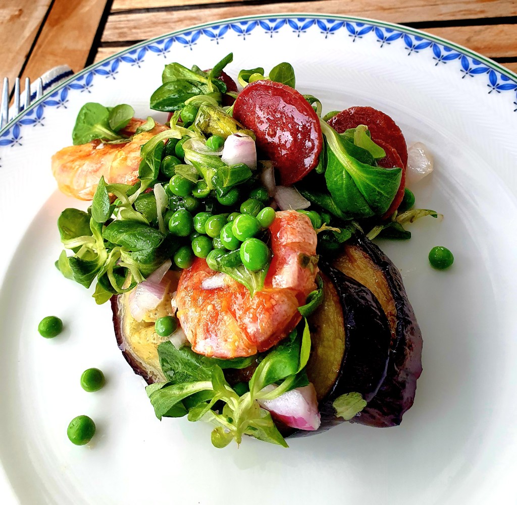 Stekte skiver av aubergine, morrpølse og stekte rå reker- det var kanskje ikke det du først tenkte på til en salat. Sammen med en en fantastisk olje-sitrondressing ble dette faktisk en fantastisk god smaksopplevelse.