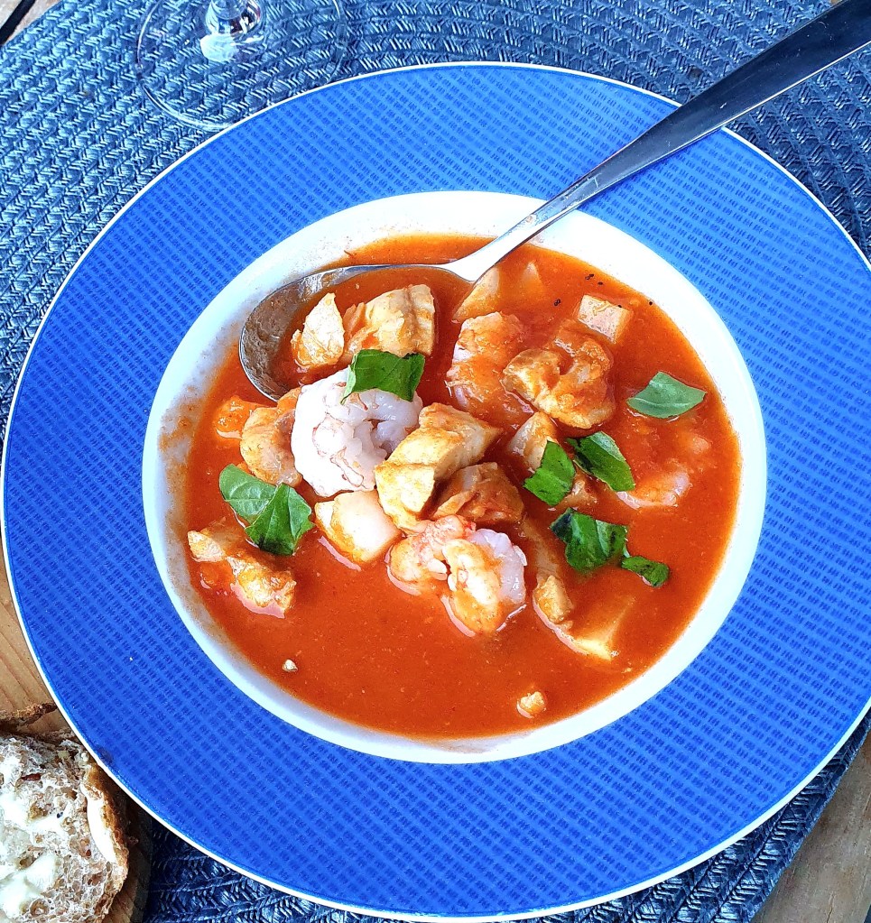 Paprika, løk og hvitløk, gulerøtter og fennikel ble surret i olje i en litt vid gryte sammen med timianstilkene. Når grønnsakene såvidt hadde begynt å få litt farge, ble tomatpurèen og de hermetiske tomatene tilsatt. Hermetikkboksenble fylt med vann to ganger som også ble helt oppi gryta sammen med blåskjellkraften og fiske-og oysterssausene. Kokte opp og lot suppen simre i ca 15 minutter til grønnsakene var møre. Fjernet så timianstilkene og kjørte suppen med en stavmikser slik at den ble jevn. Kokte opp igjen og smakte til med salt. Tilsatte så nepebitener som fikk koke i 5 minutter før fisken kom oppi gryta og fikk koke med noen minutter.